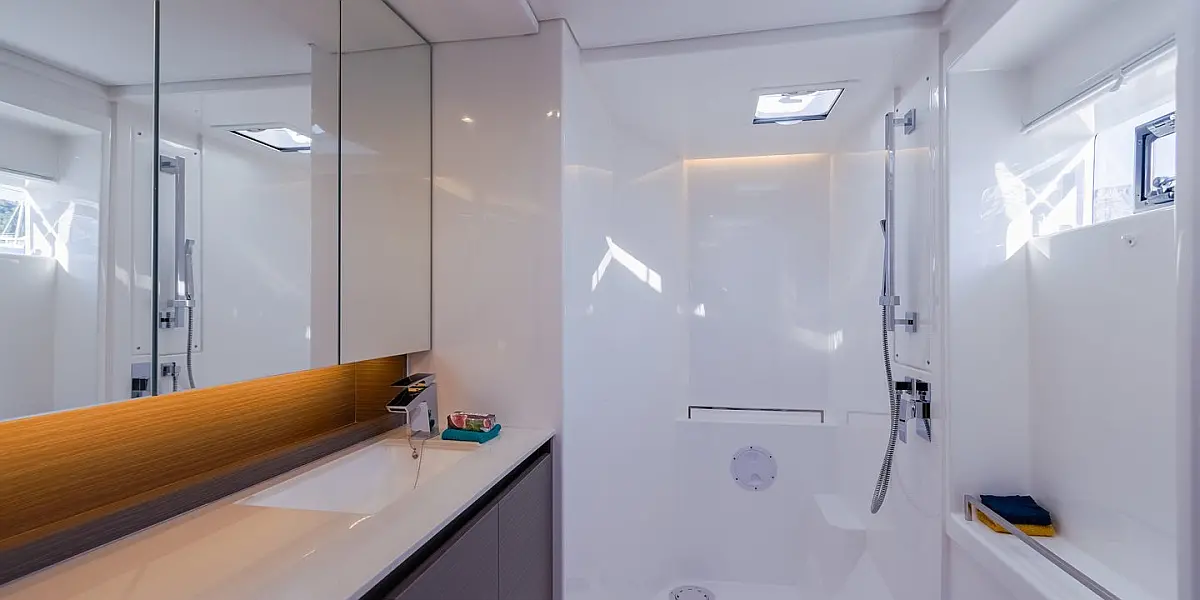 Steering wheel (1), Emergency tiller, Secondary anchor (15kg Britany anchor with chain & warp), Primary anchor (25kg stainless steel, with galvanized chain), Electric windlass, Swimming ladder, Cockpit shower (with hot & cold water mixer)