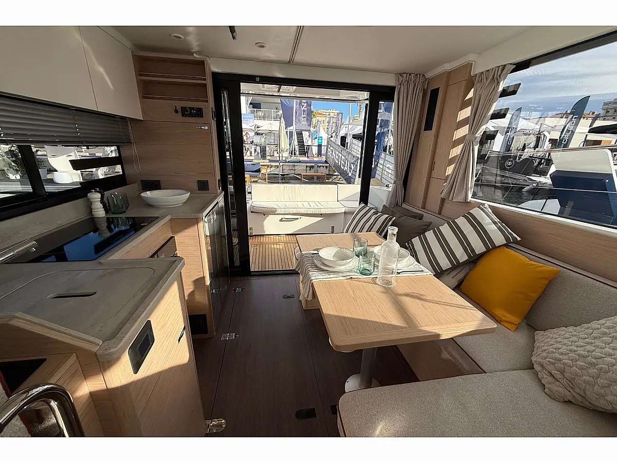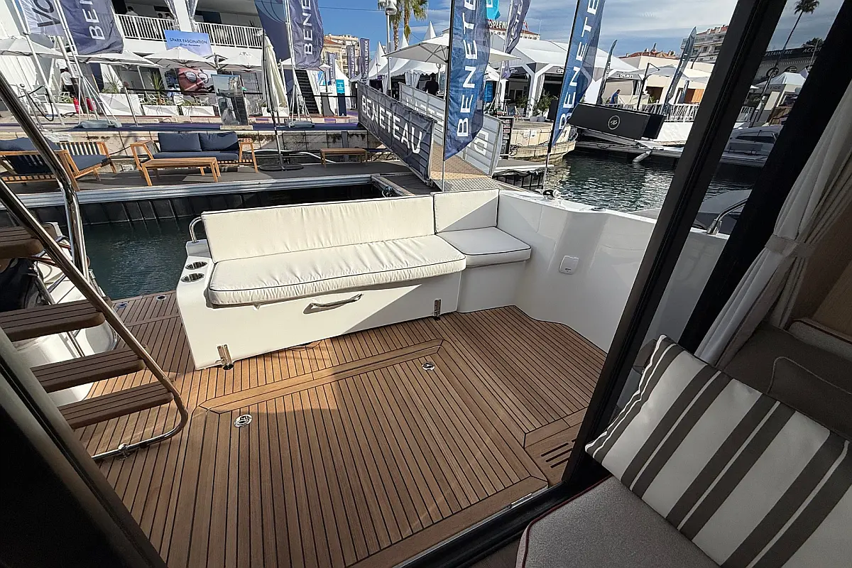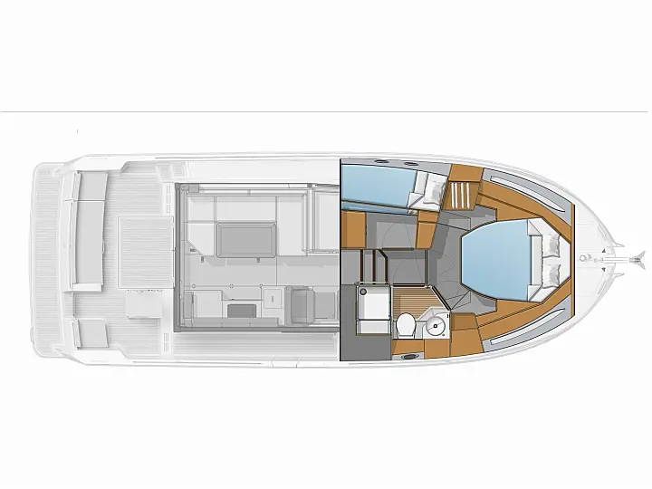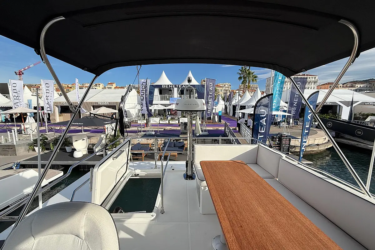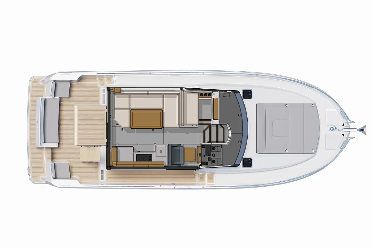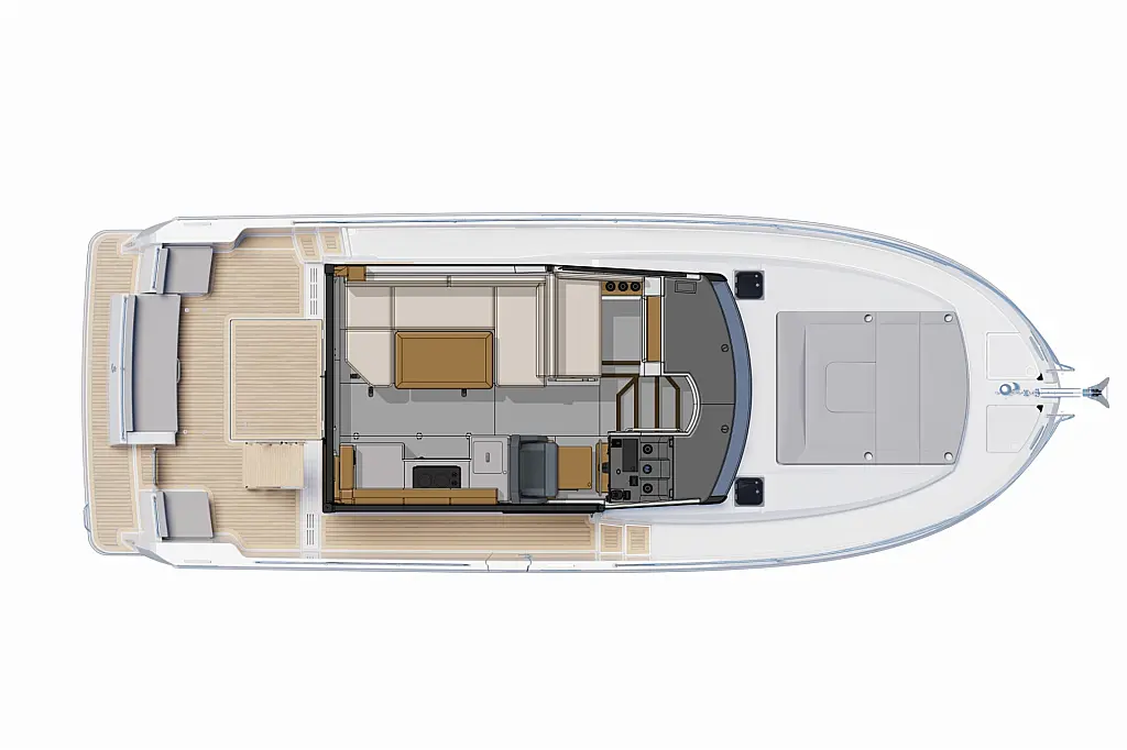 12V cockpit socket, Bilge pumps, Cockpit chairs (2), Cup holders, Deck washing pump, Bimini, Flybridge fridge (40 L), Gangway (foldable), Led navigation lights, Mooring anchoring kit, Solid wood cockpit floor and starboard catwalk, Sunbathing cushions, Teak cockpit table (foldable), sun tent in cockpit