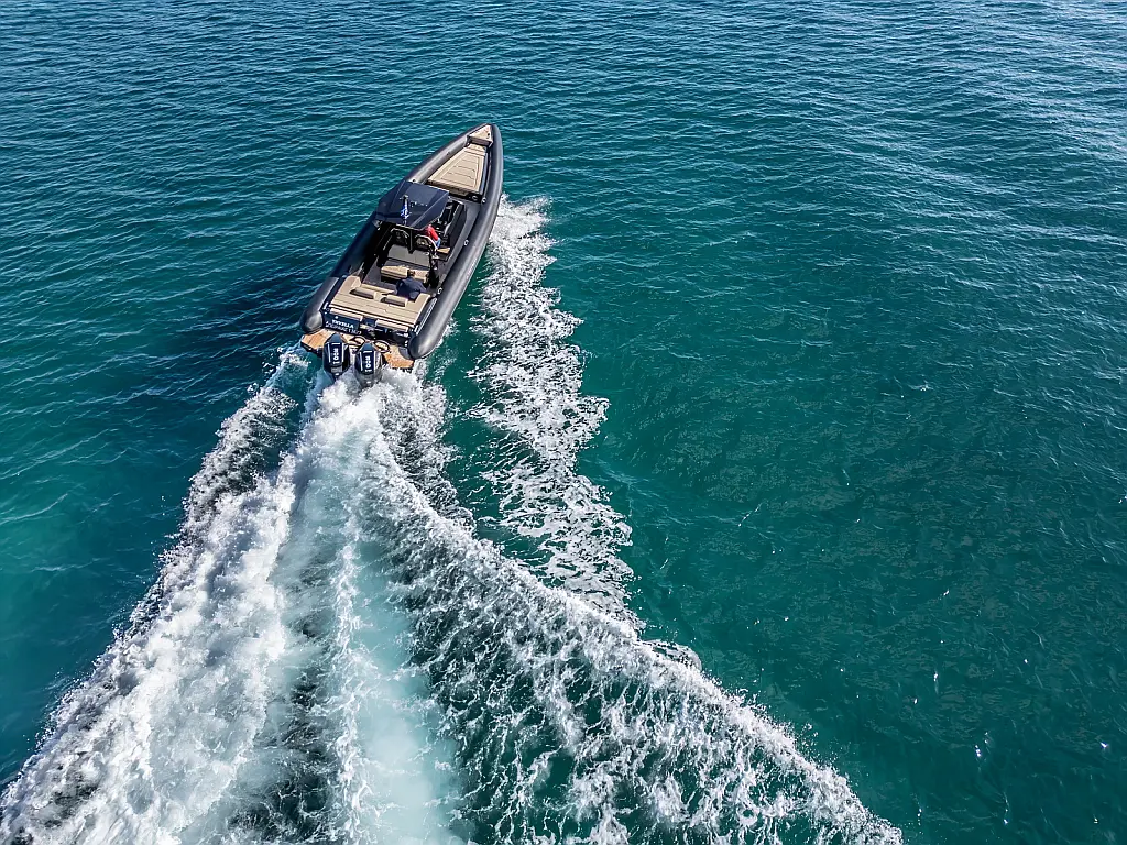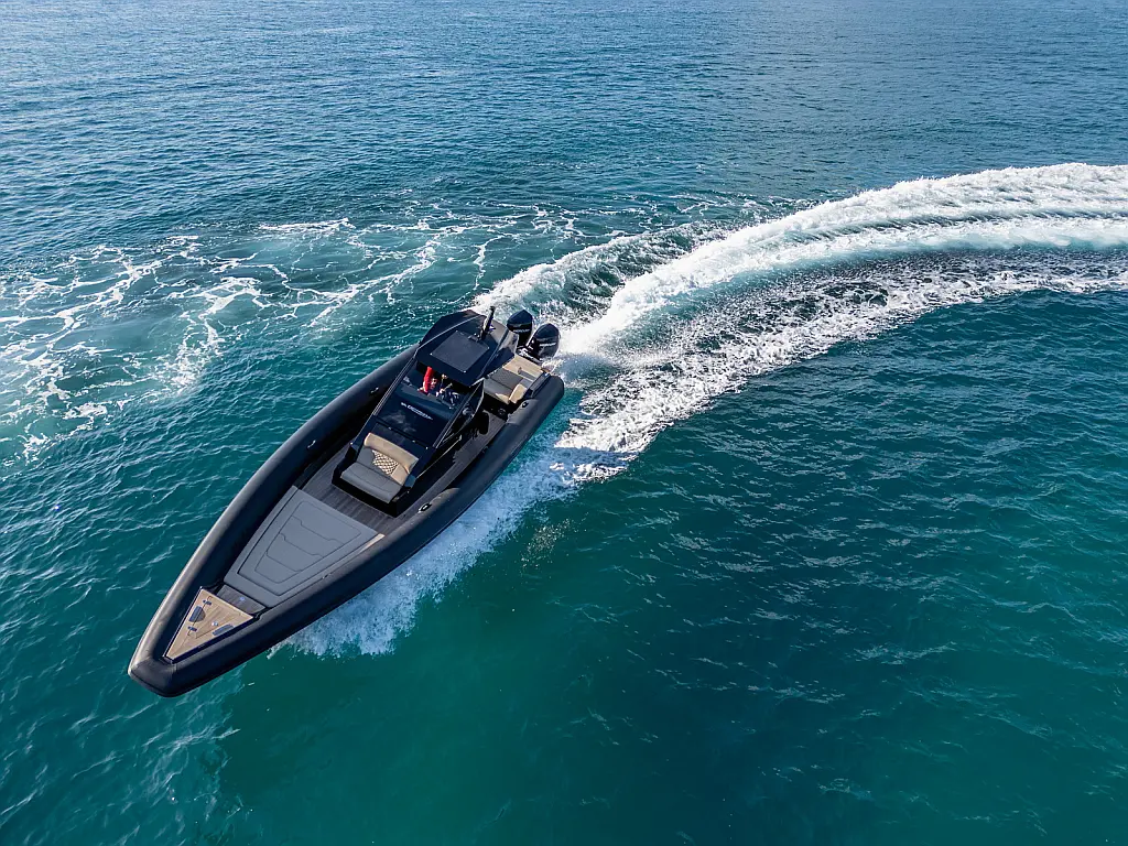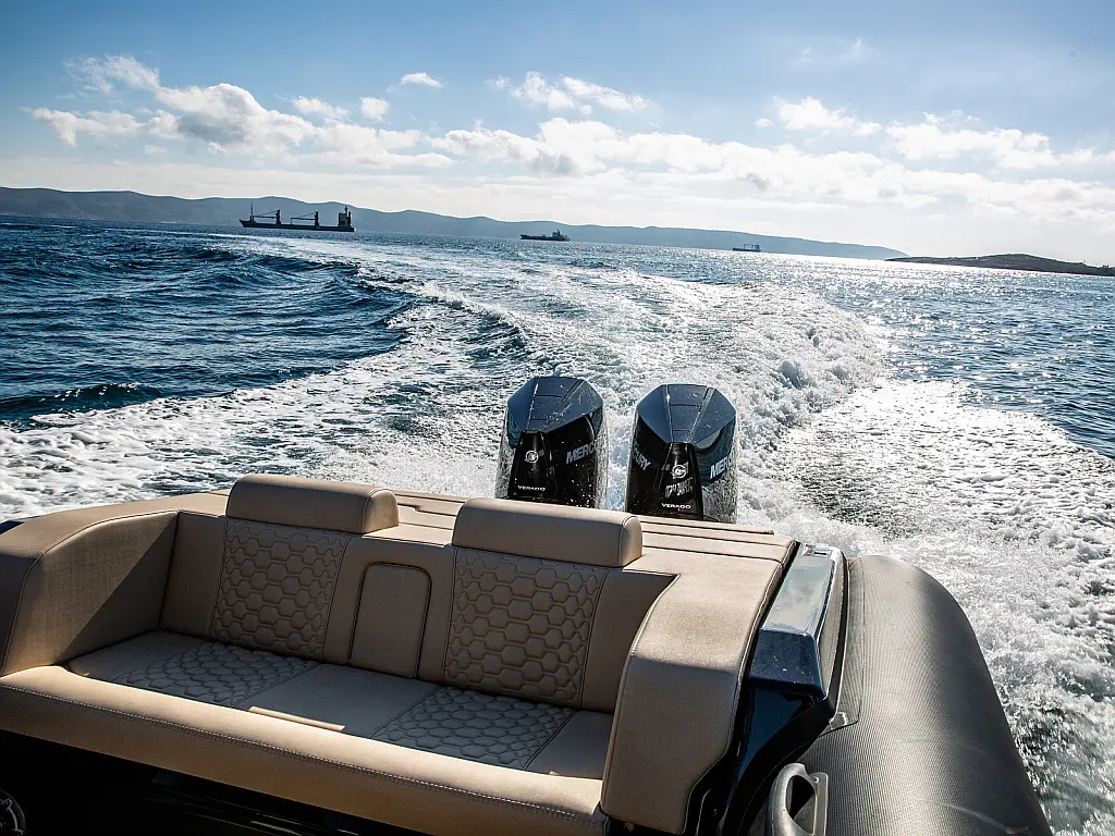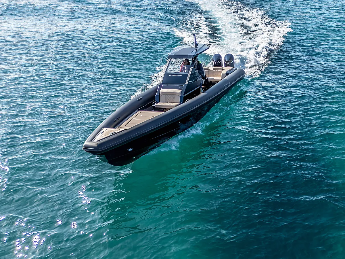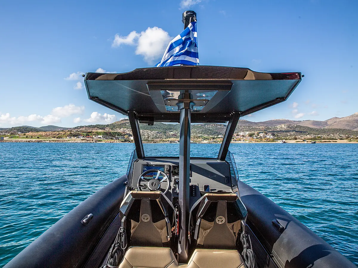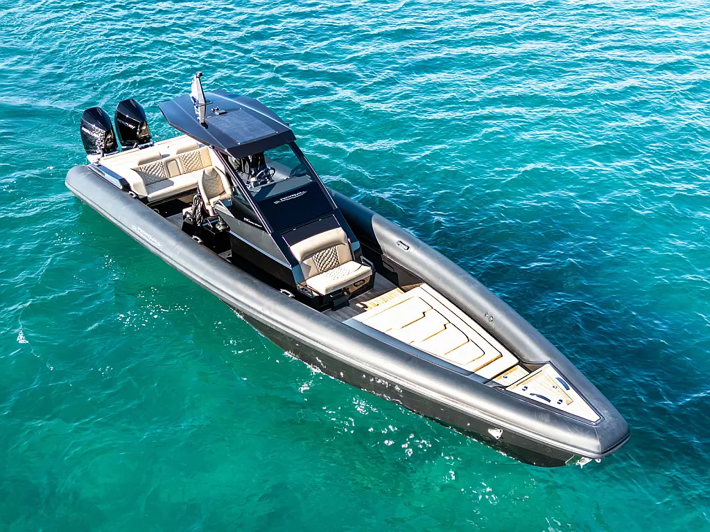 Electric windlass with counter, Dinghy, Fenders, 220V shore power cable, Anchor, Boat hook, Bimini top, Removable teak table with carbon pole, Cabin set up in bow area, Carbon Hard top with full glass and wiper, Sun tent with Poles and 3 side protection tents, Swimming Ladder, Shower on deck, Helmsman seat
