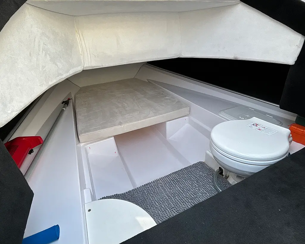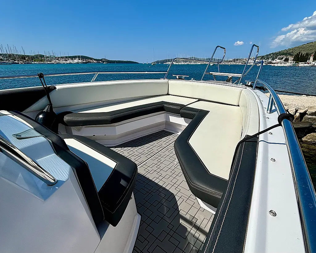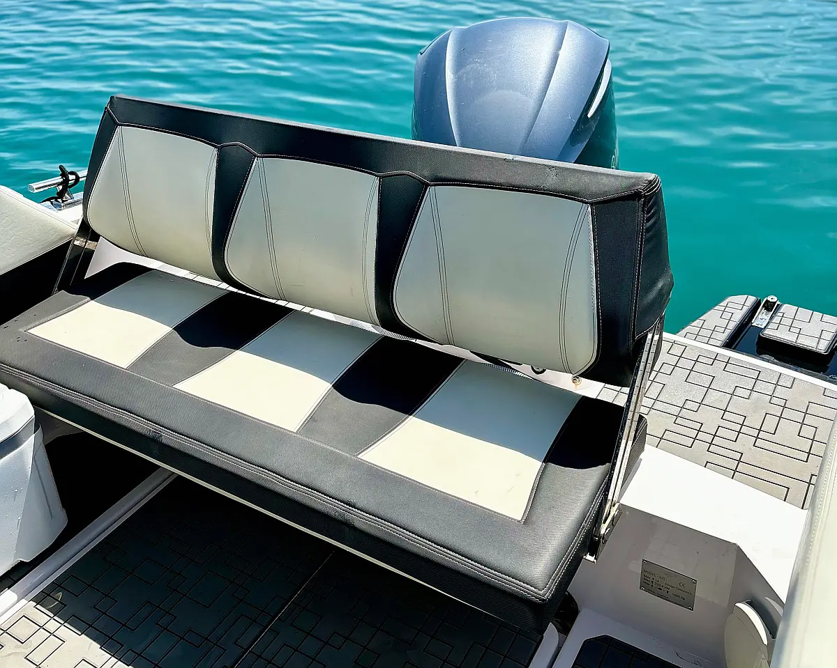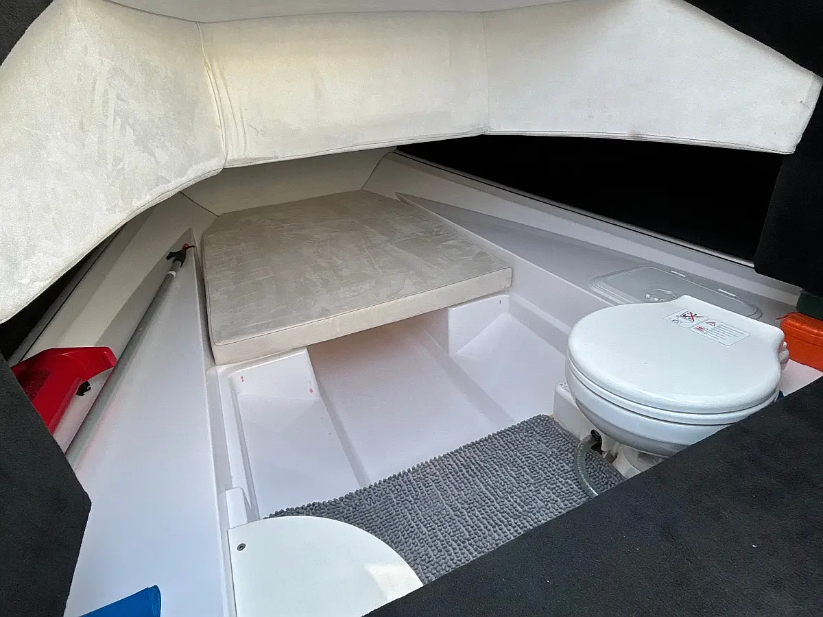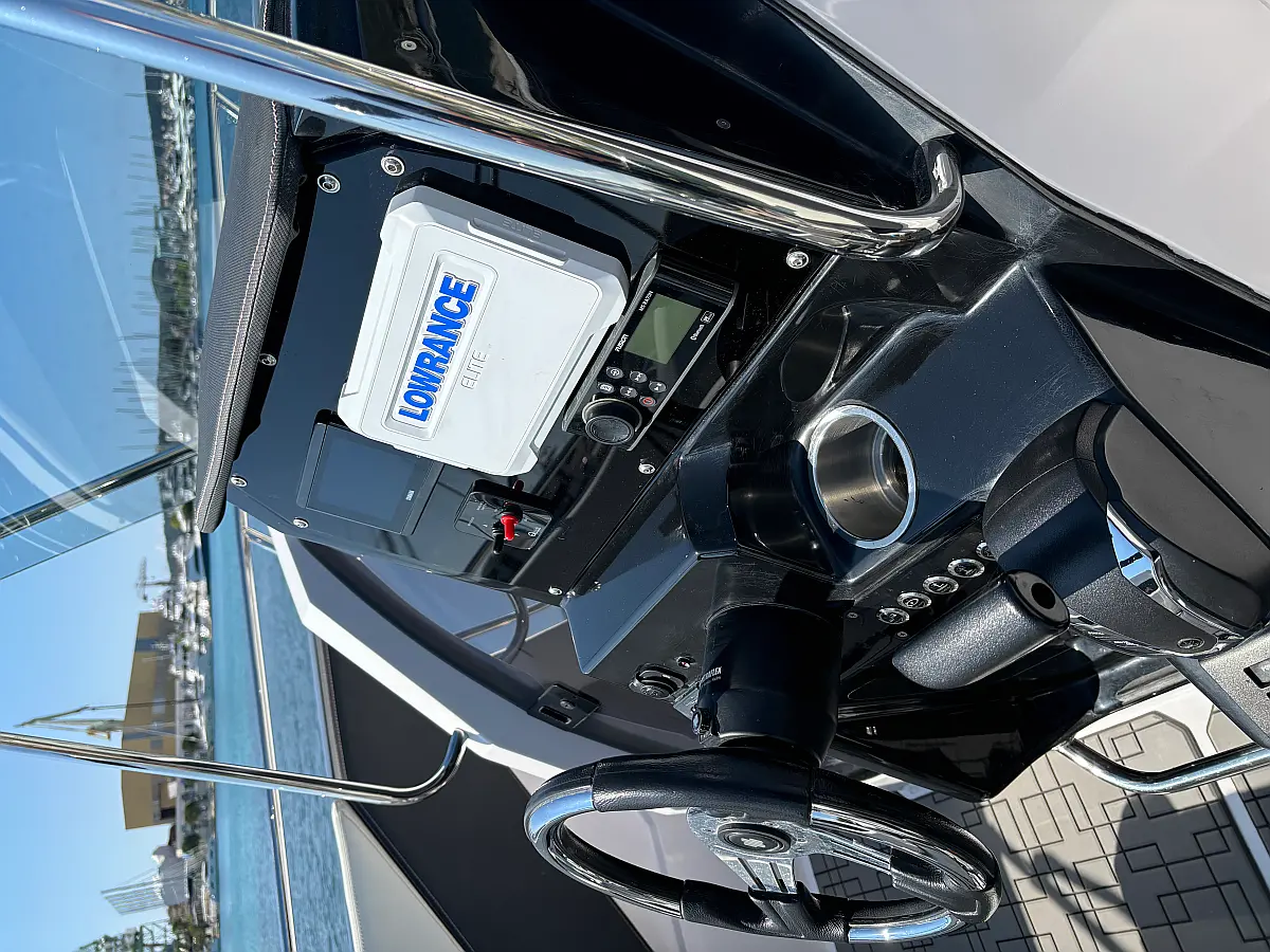 12V car type socket, Automatic bilge pump, Binoculars, Cockpit loudspeaker, GPS/Chartplotter- Lowrance Elite FS 9, Distress signals, Emergency flashlight, Fog horn, Kill switch (safety lanyard), Main power switch, No. of batteries - 2, Portable fire extinguisher, Sundeck cushions, Water sports pole, Interior table, Anchor, Bilge pump electric, Boat documents, Complete mooring equipment, Digital speedometer, Digital speedometer, Distress torches, Fenders, Hand tools, Life jackets, Medicine chest, Radio/USB slot, Swim ladder, Anchor light, Bimini top, Complete safety equipment, Boat hook, Digital tachometer, Electricity 12V (false), Fishing rod holders (false), Interior lighting (false), Life jackets for child, Navigation lights, Paper sea charts and equipment, Spare anchor, Electric Toilet, Gps with plotter, Bilge pump automatic, Fish finder, Bathing lader, Deck shower, Stereo sistem with Bluetooth, All safety and navigation equipment, Electric Winch (Windlass), Sundeck, LED underwater lights, LED cockpit lights