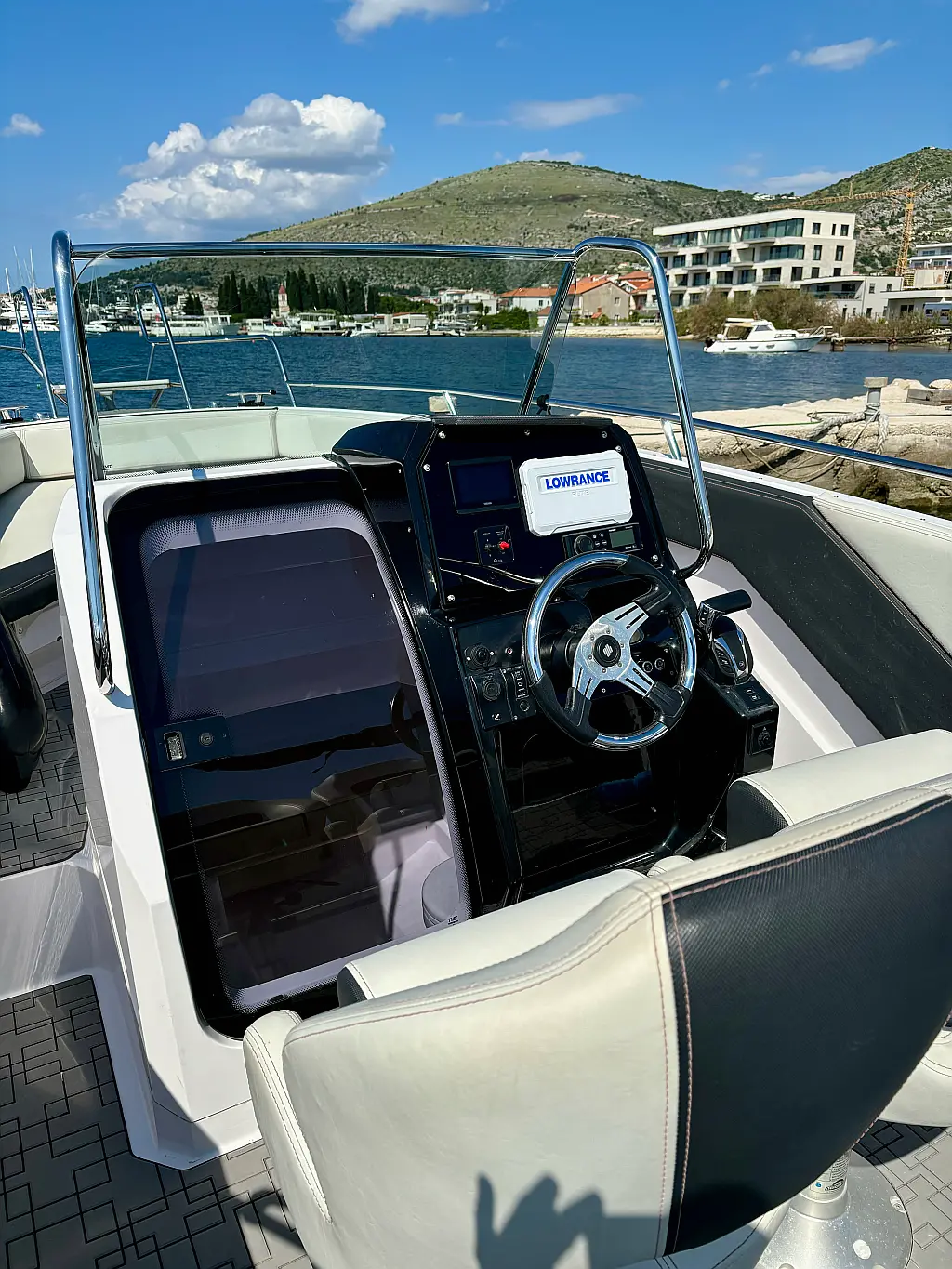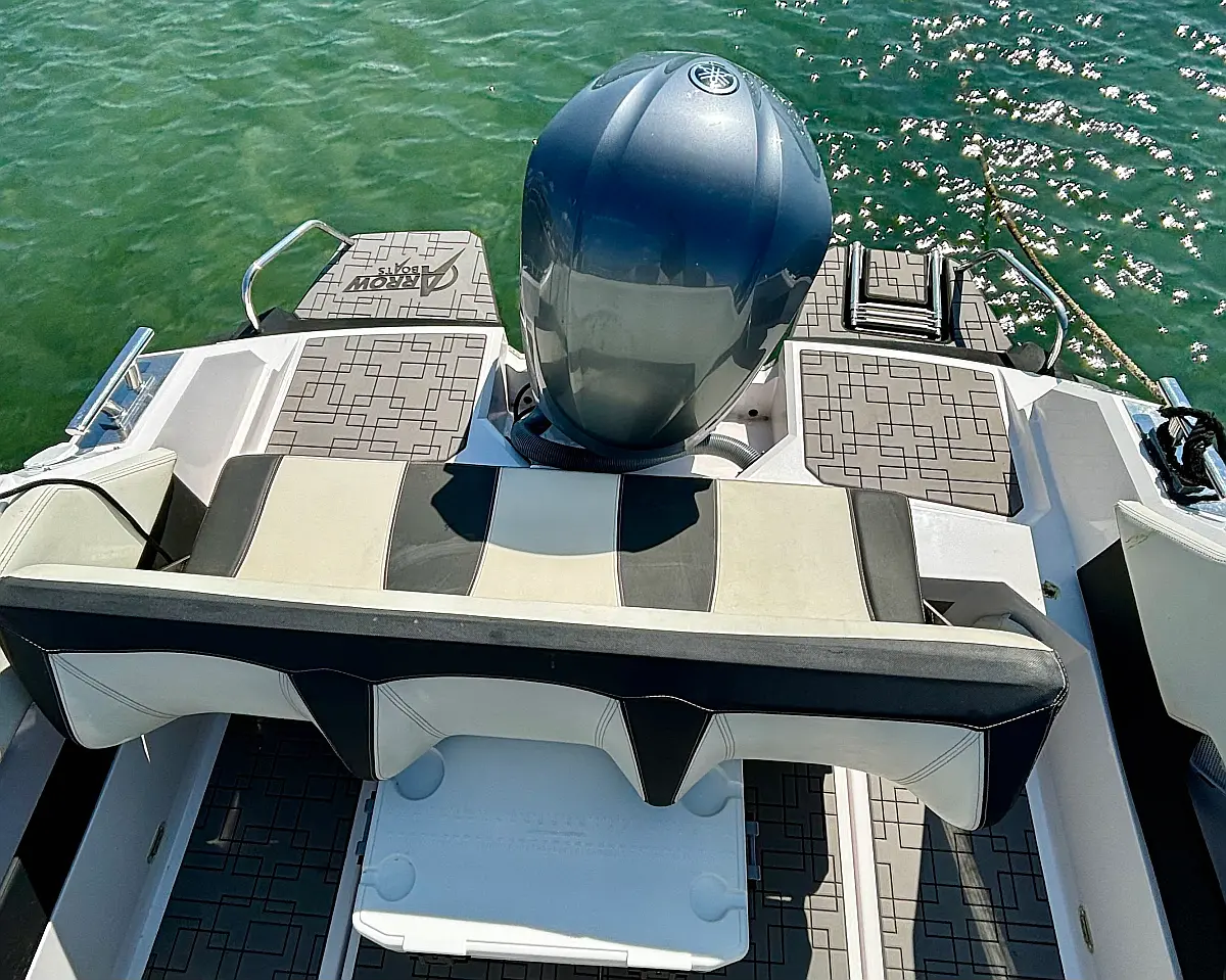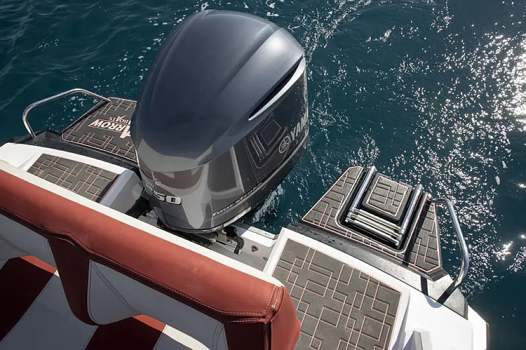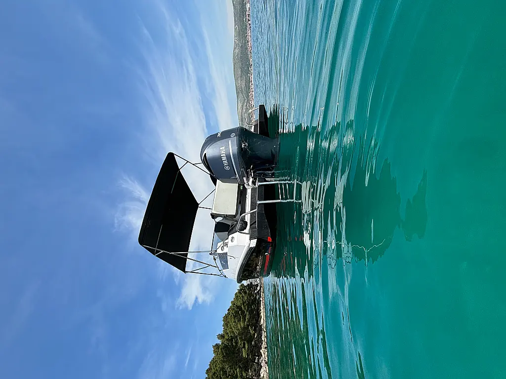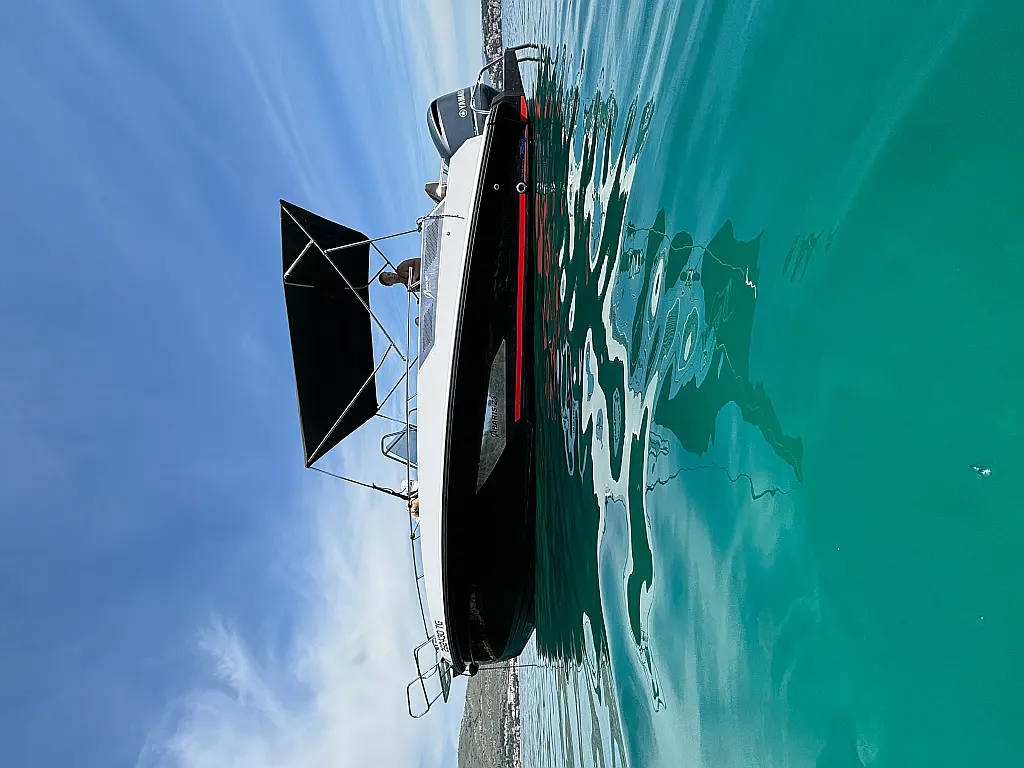 12V car type socket, Automatic bilge pump, Binoculars, Cockpit loudspeaker, GPS/Chartplotter- Lowrance Elite FS 9, Distress signals, Emergency flashlight, Fog horn, Kill switch (safety lanyard), Main power switch, No. of batteries - 2, Portable fire extinguisher, Sundeck cushions, Water sports pole, Interior table, Anchor, Bilge pump electric, Boat documents, Complete mooring equipment, Digital speedometer, Digital speedometer, Distress torches, Fenders, Hand tools, Life jackets, Medicine chest, Radio/USB slot, Swim ladder, Anchor light, Bimini top, Complete safety equipment, Boat hook, Digital tachometer, Electricity 12V (false), Fishing rod holders (false), Interior lighting (false), Life jackets for child, Navigation lights, Paper sea charts and equipment, Spare anchor, Electric Toilet, Gps with plotter, Bilge pump automatic, Fish finder, Bathing lader, Deck shower, Stereo sistem with Bluetooth, All safety and navigation equipment, Electric Winch (Windlass), Sundeck, LED underwater lights, LED cockpit lights