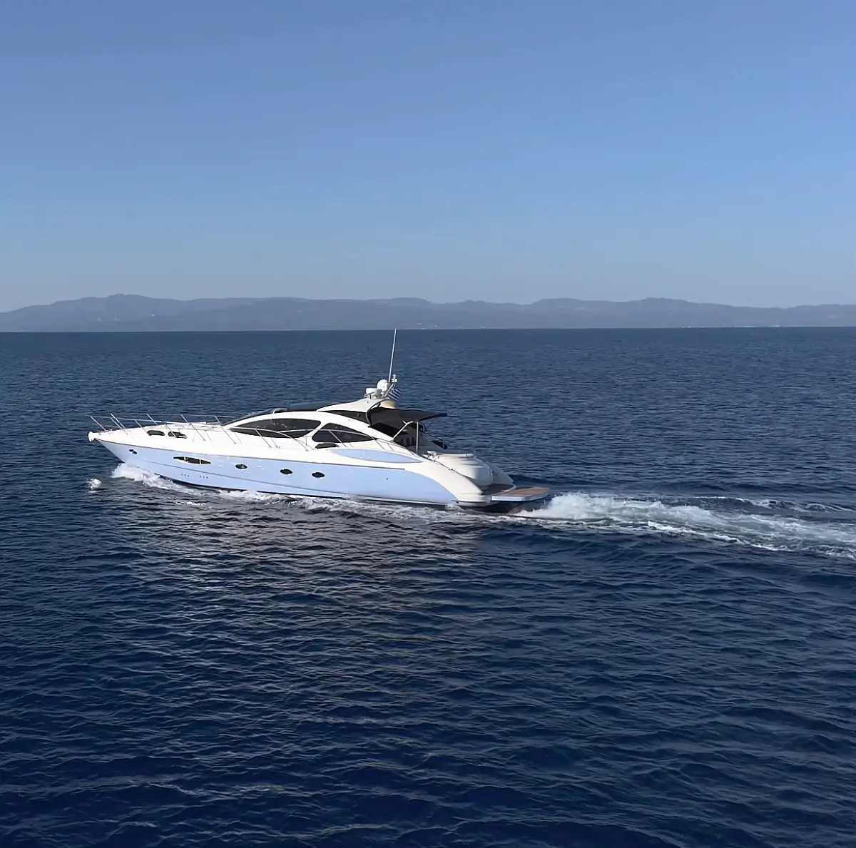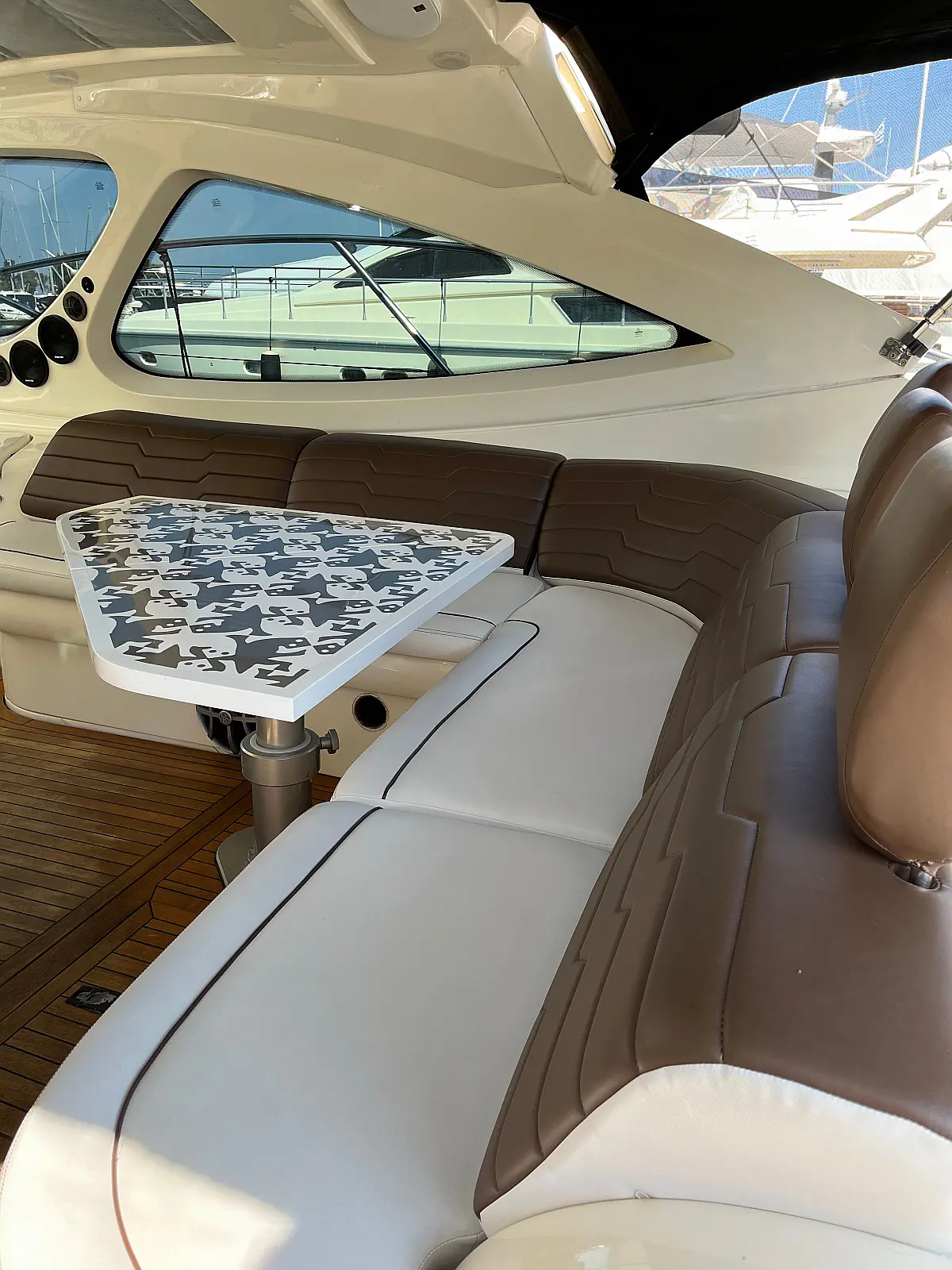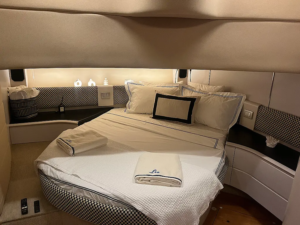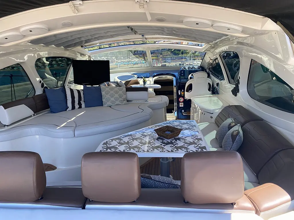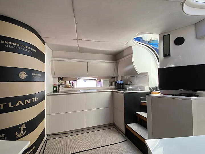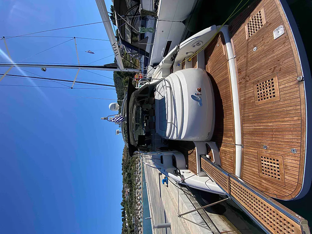 Bow thrust, TV, VHF, Fridge, Air condition, Microwave, Generator, Stereo surround system, Electric bilge pump, Manual Bilge pump, Heating, Inverter, Radar, Aft shower, Cockpit table, Sun cushions in stern, bow and in cockpit, Deep freezer, Swimming Ladder, Grill, Electric Platform, Stern thruster, Electric windlass, Bow solarium