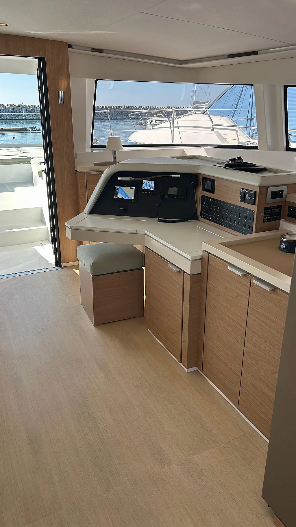 AIS, Solar panels, VHF radio, Wind indicator, Cabin fans (7), Fridge, Microwave oven, Lazy bag, Autopilot, Electric bilge pump, Electric winch (3), Flybridge, Electric windlass, GPS plotter, Inverter, Tender and outboard