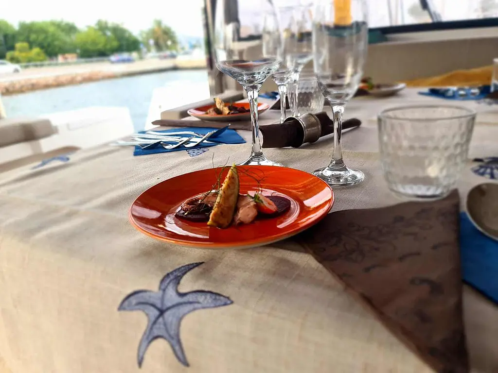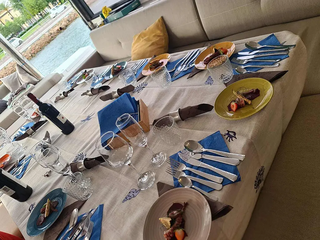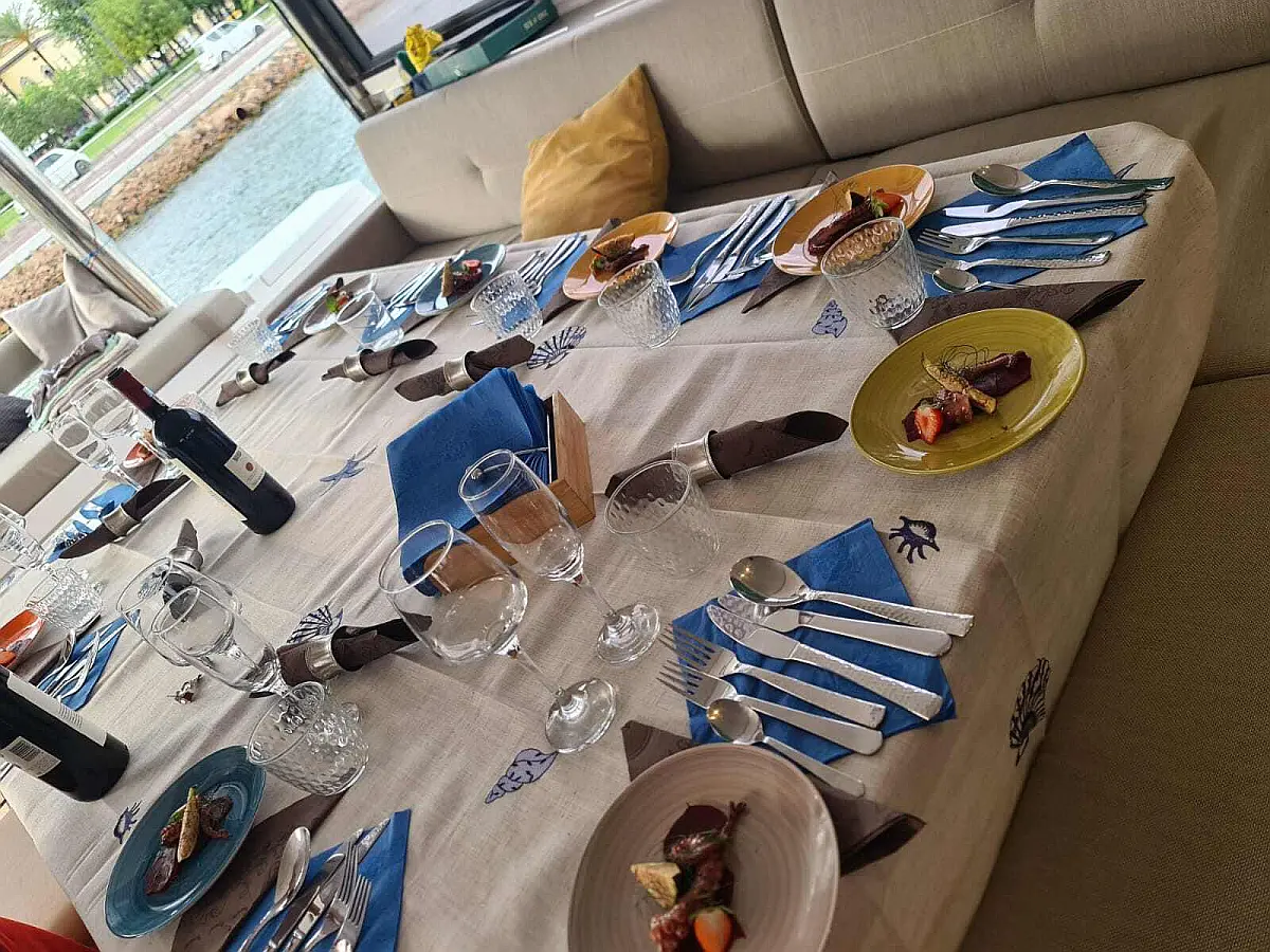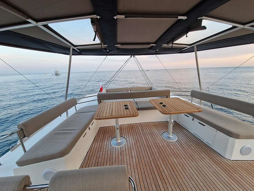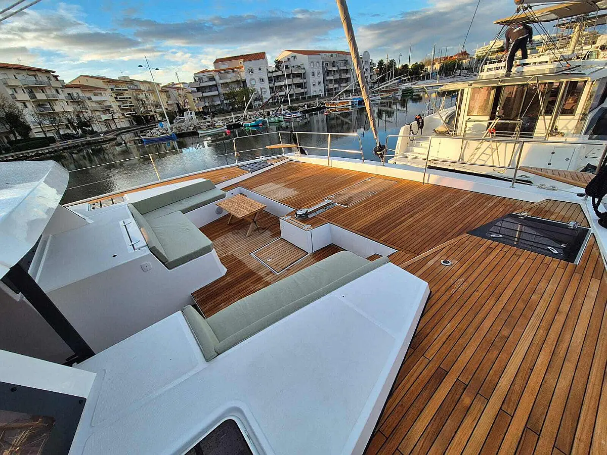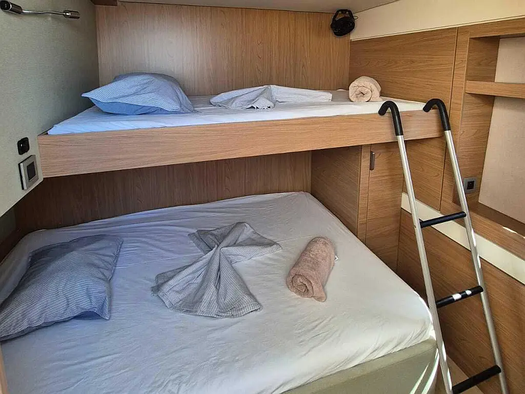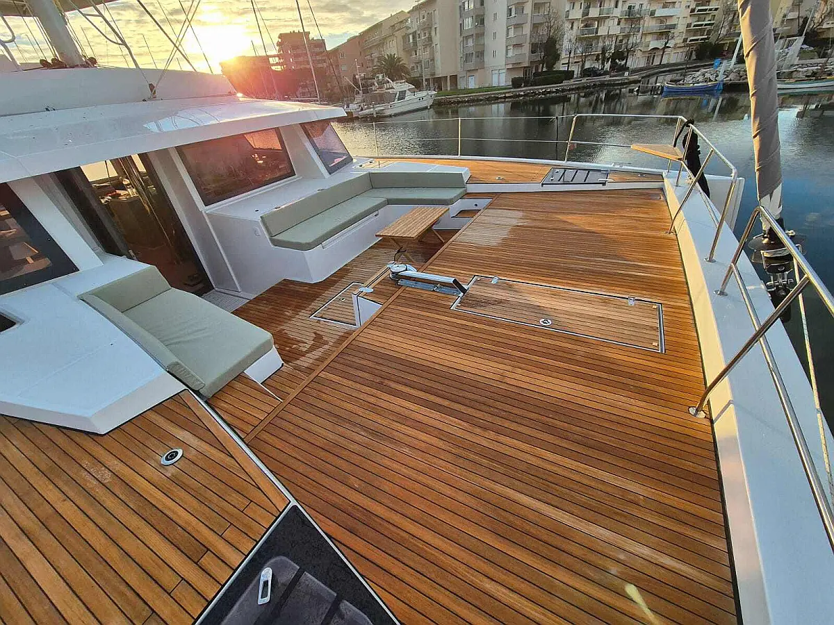 Cockpit cushions, 12V socket, Cockpit table, Air condition, Dinghy, Dishwasher, Electric anchor windlass, Freezer, Refrigerator, Fans, Fishing rods, Fully equipped kitchen, Generator, BBQ, Bluetooth Radio, Nespresso coffee machine, Snorkeling equipment, SUP, Teak deck, TV, Underwater scooter, Teak cockpit, Washing machine, Water maker, Water toys