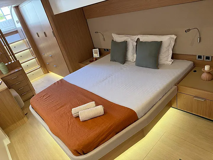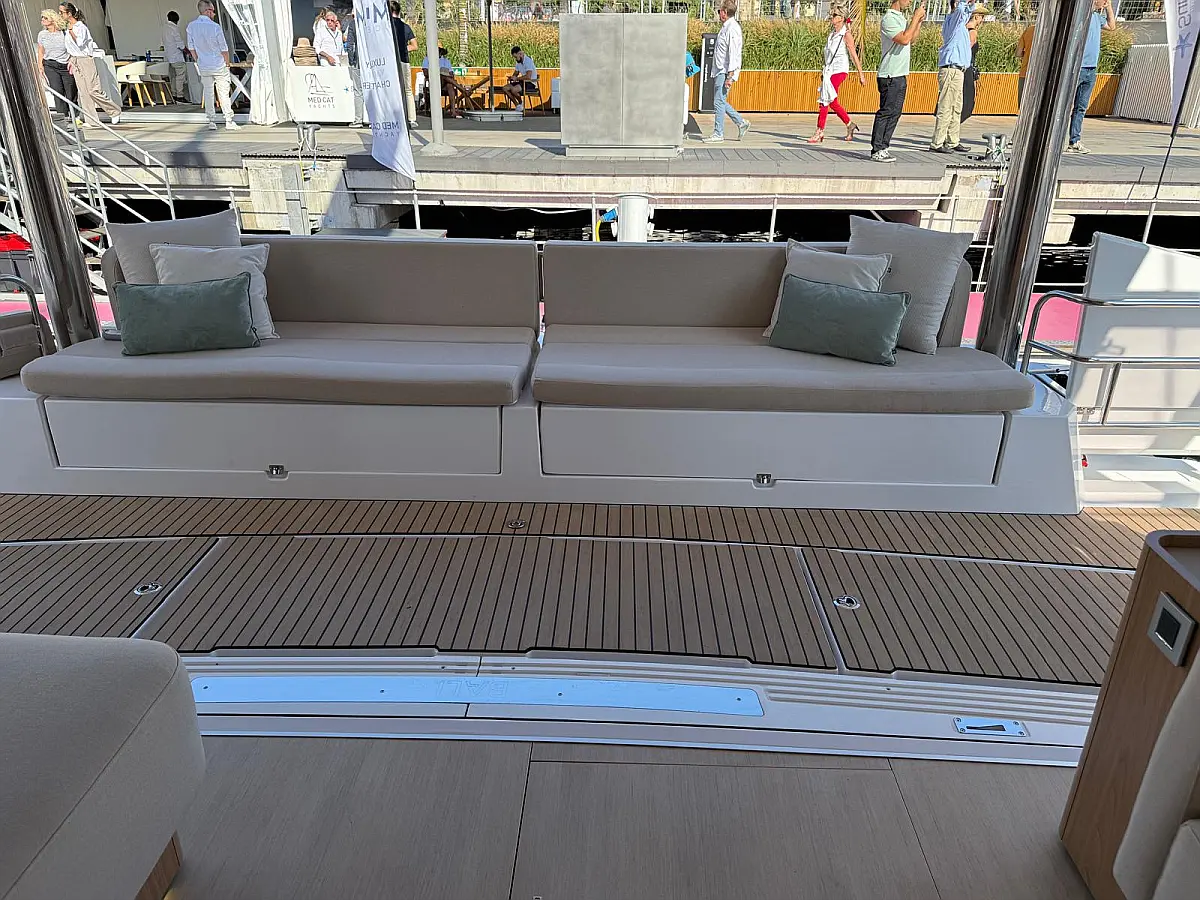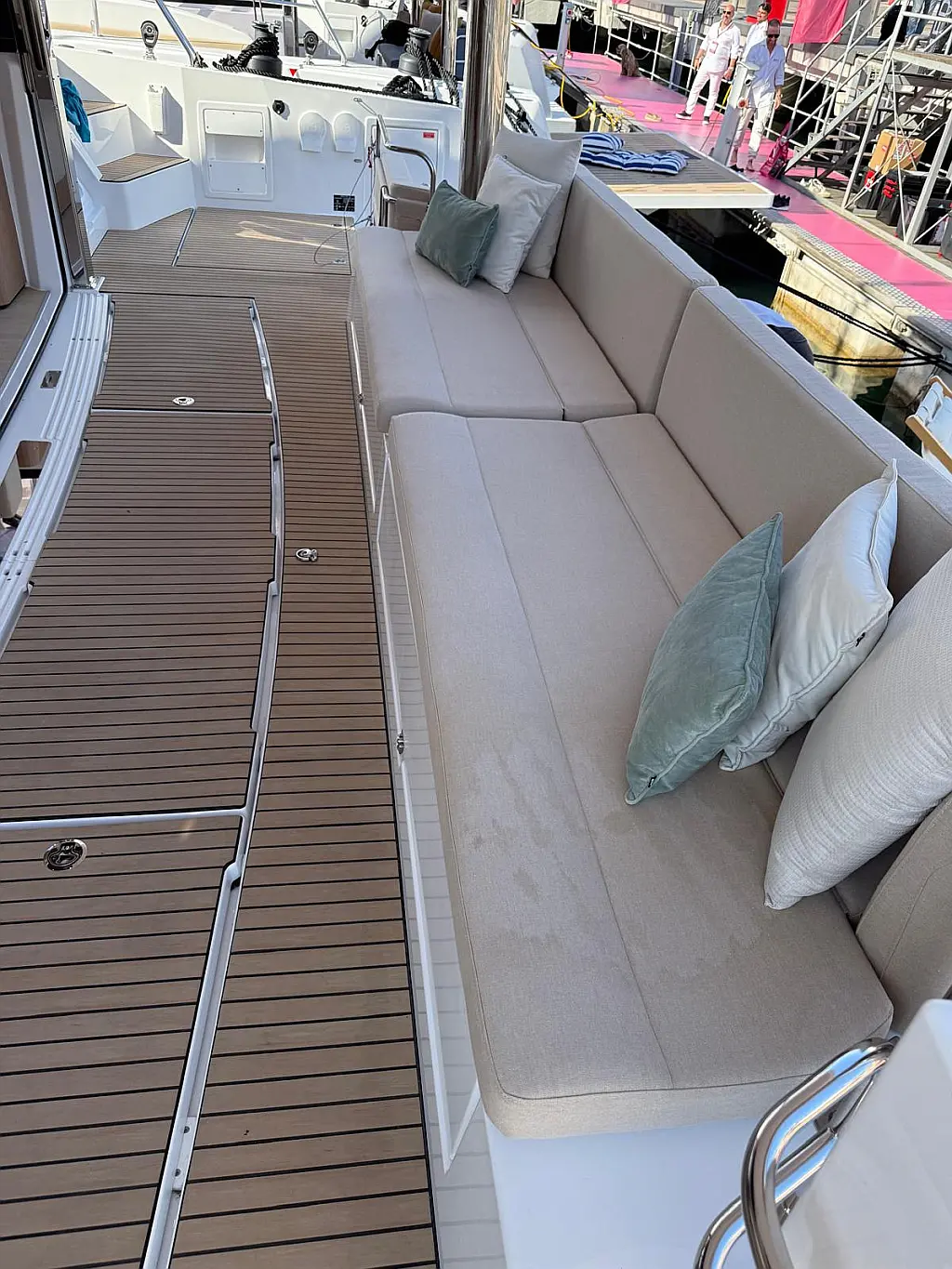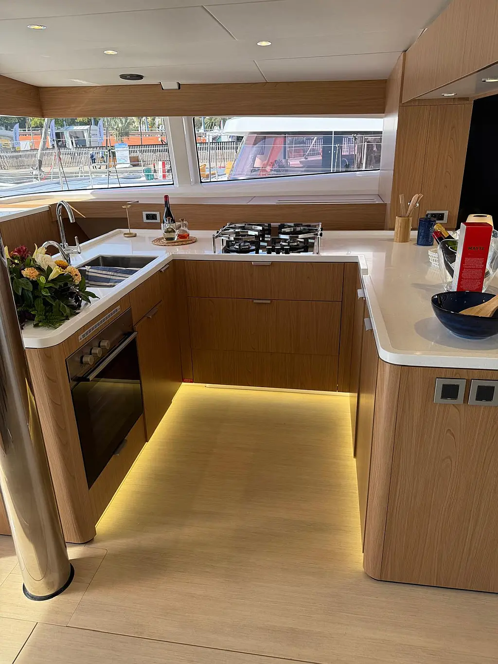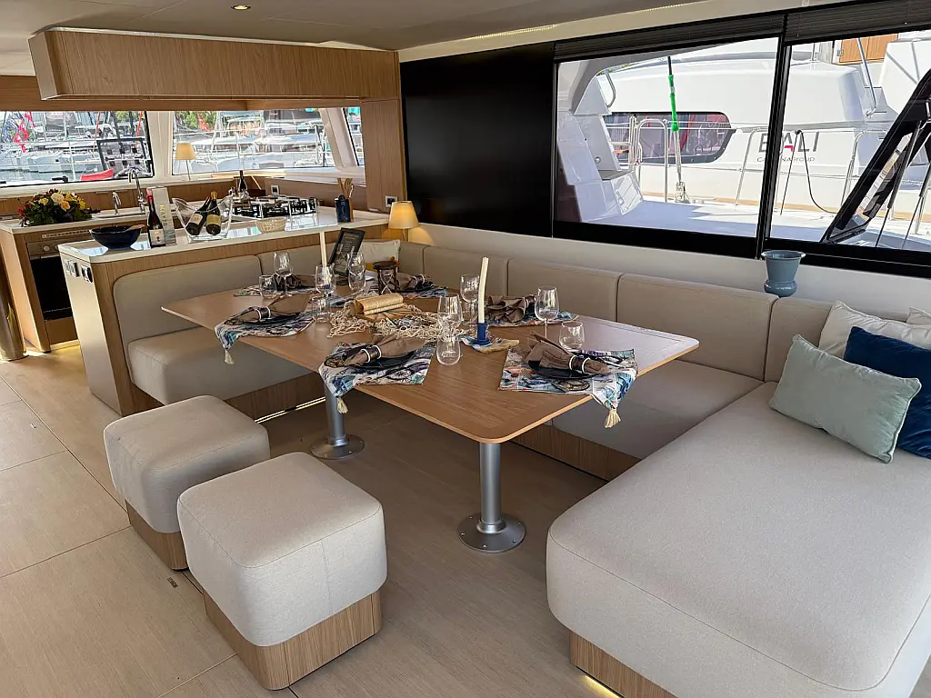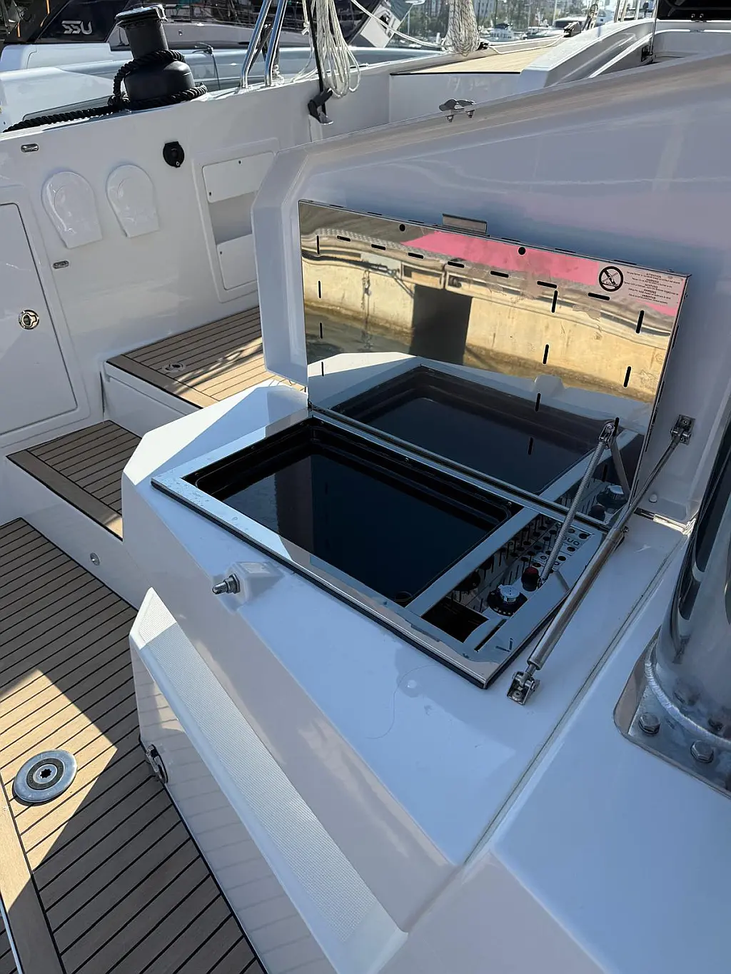 Cuscini, Doccetta esterna, Scaletta bagno, Forno e fornello a 2 fuochi, Stoviglie e posate, Cuscini, Cuscineria pozzetto, Watermaker 12V, Generator (1), Air Conditioning Dinette, Air Conditioning Cabins, Lavastoviglie, Cassa bluetooth, Forno a microonde, Barbecue, Freezer, Frigorifero, Ventilatori nelle cabine (5), Pannelli solari, macchina per ghiaccio, TV in dinette