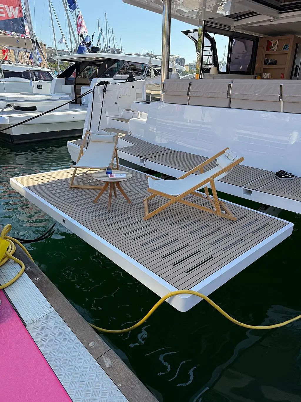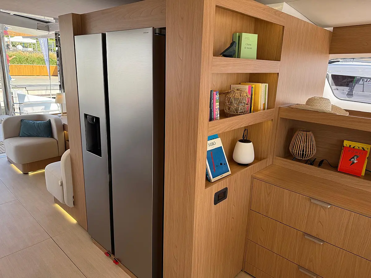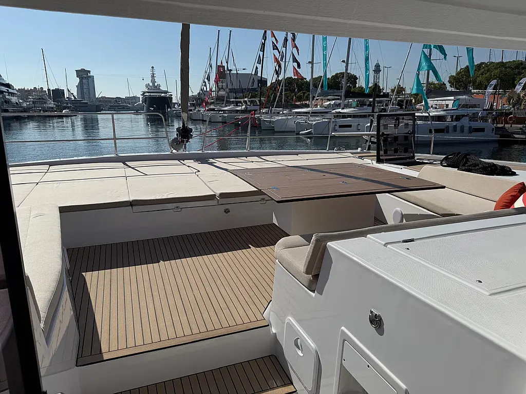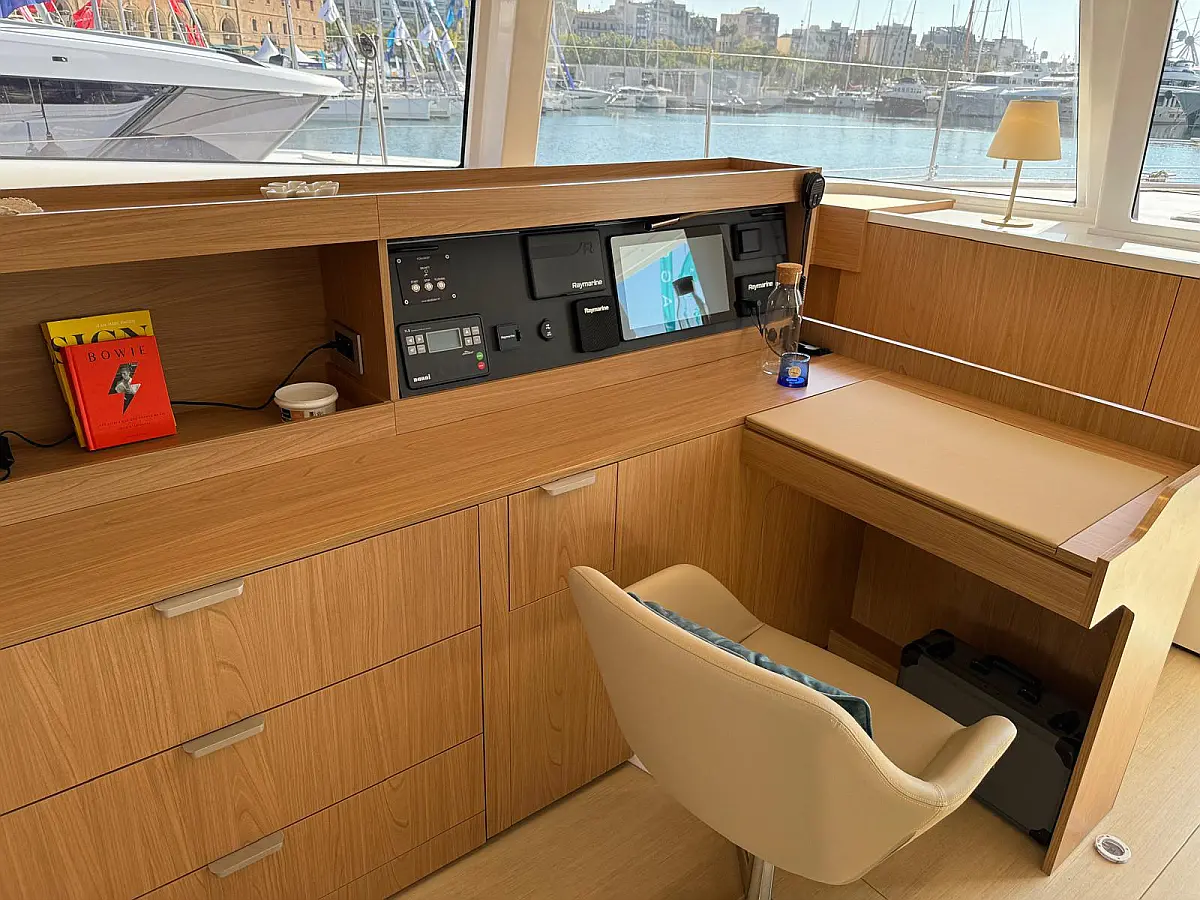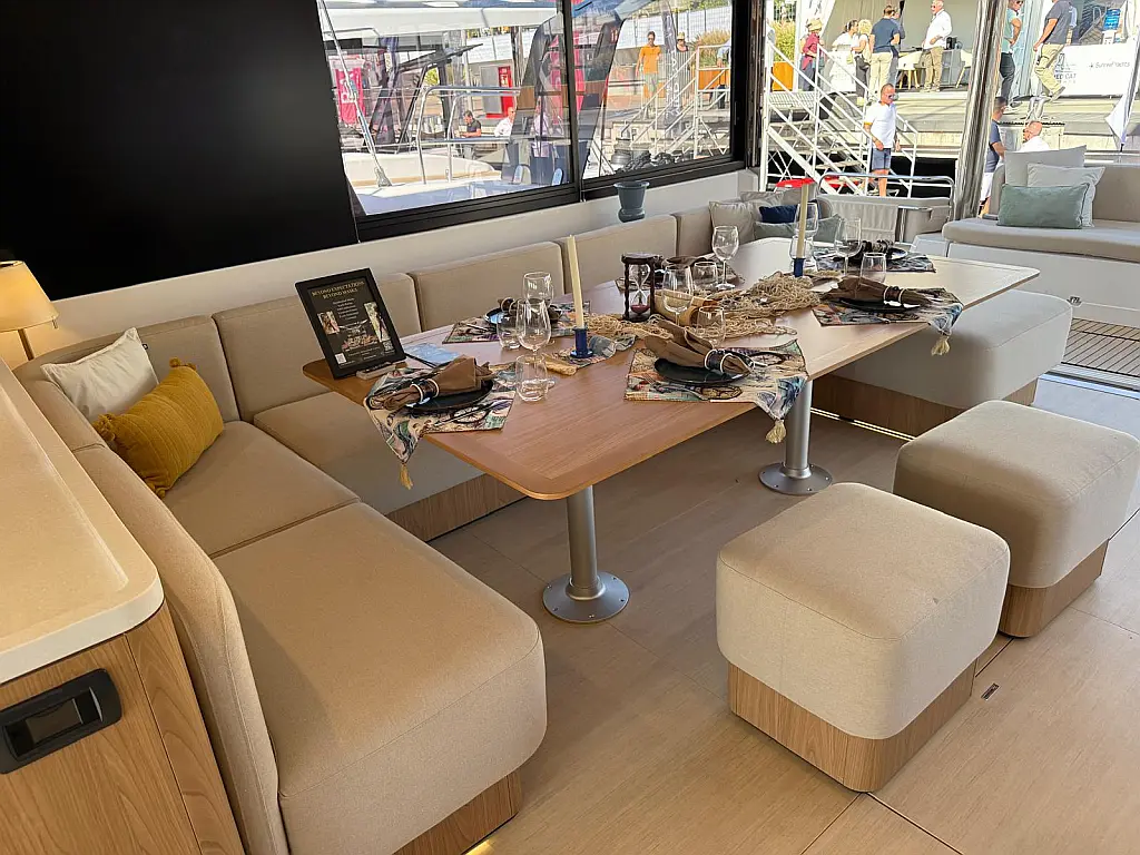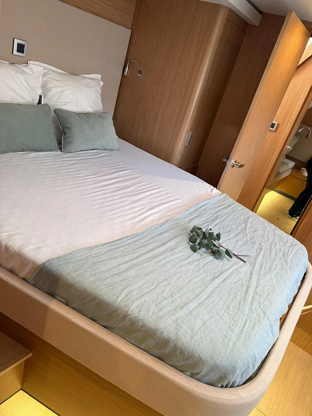 Cuscini, Doccetta esterna, Scaletta bagno, Forno e fornello a 2 fuochi, Stoviglie e posate, Cuscini, Cuscineria pozzetto, Watermaker 12V, Generator (1), Air Conditioning Dinette, Air Conditioning Cabins, Lavastoviglie, Cassa bluetooth, Forno a microonde, Barbecue, Freezer, Frigorifero, Ventilatori nelle cabine (5), Pannelli solari, macchina per ghiaccio, TV in dinette