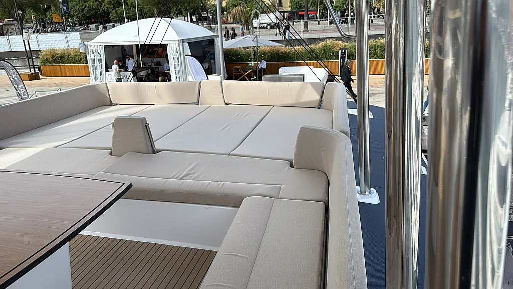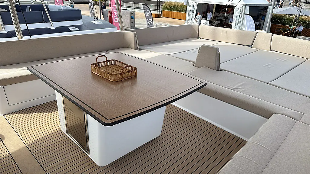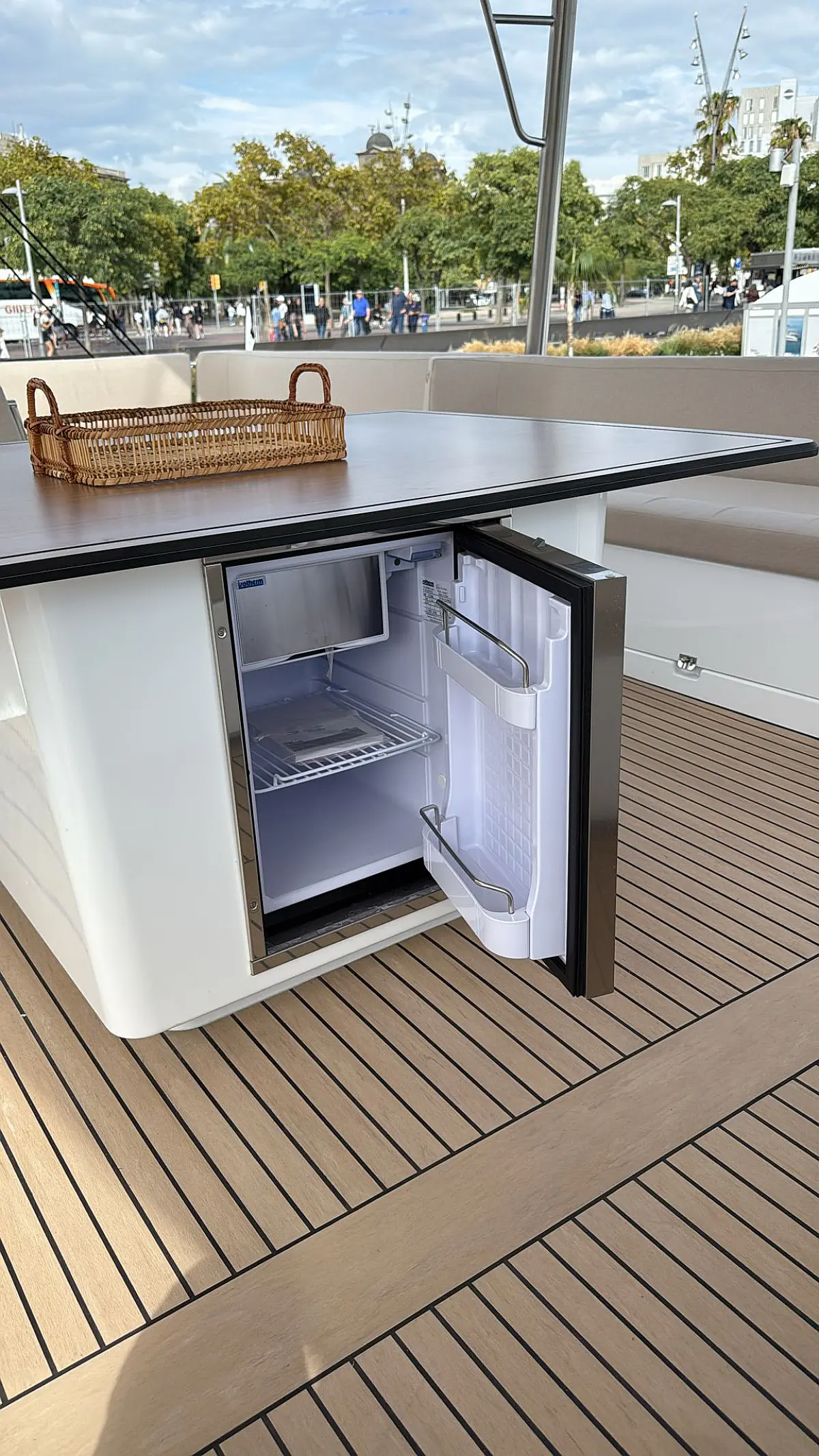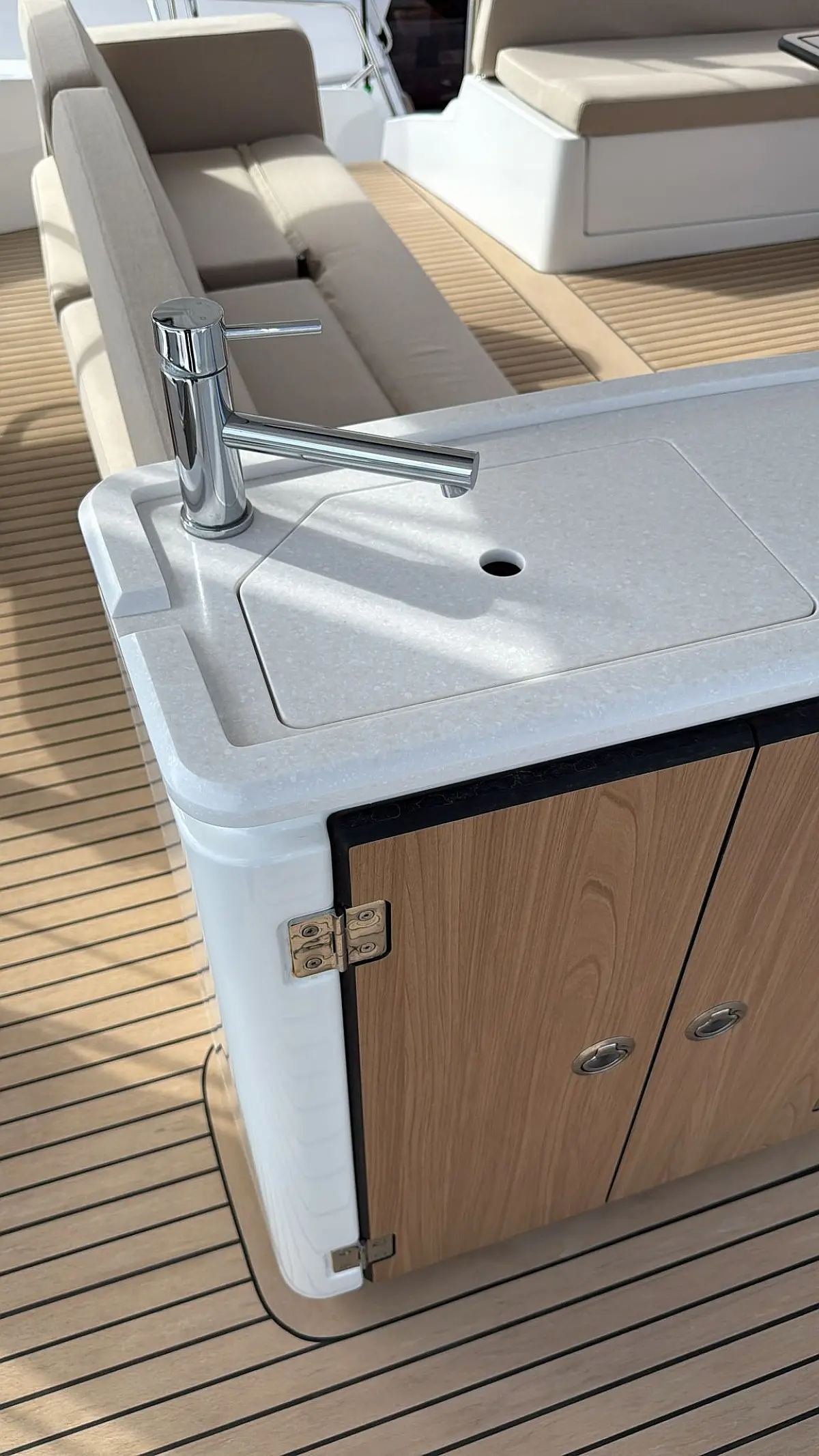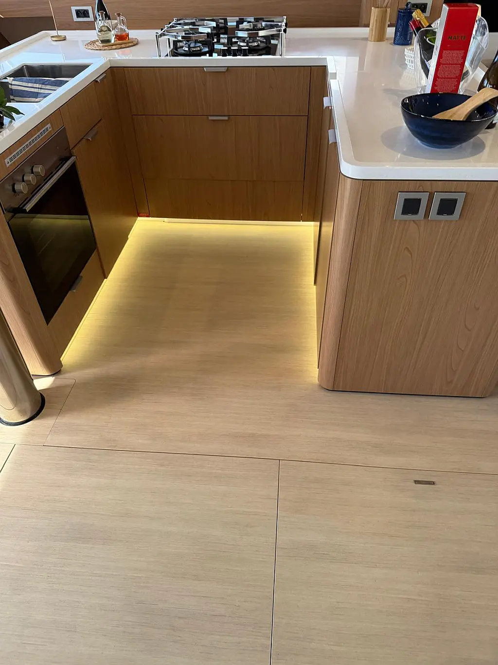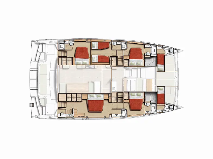 Cuscini, Doccetta esterna, Scaletta bagno, Forno e fornello a 2 fuochi, Stoviglie e posate, Cuscini, Cuscineria pozzetto, Watermaker 12V, Generator (1), Air Conditioning Dinette, Air Conditioning Cabins, Lavastoviglie, Cassa bluetooth, Forno a microonde, Barbecue, Freezer, Frigorifero, Ventilatori nelle cabine (5), Pannelli solari, macchina per ghiaccio, TV in dinette