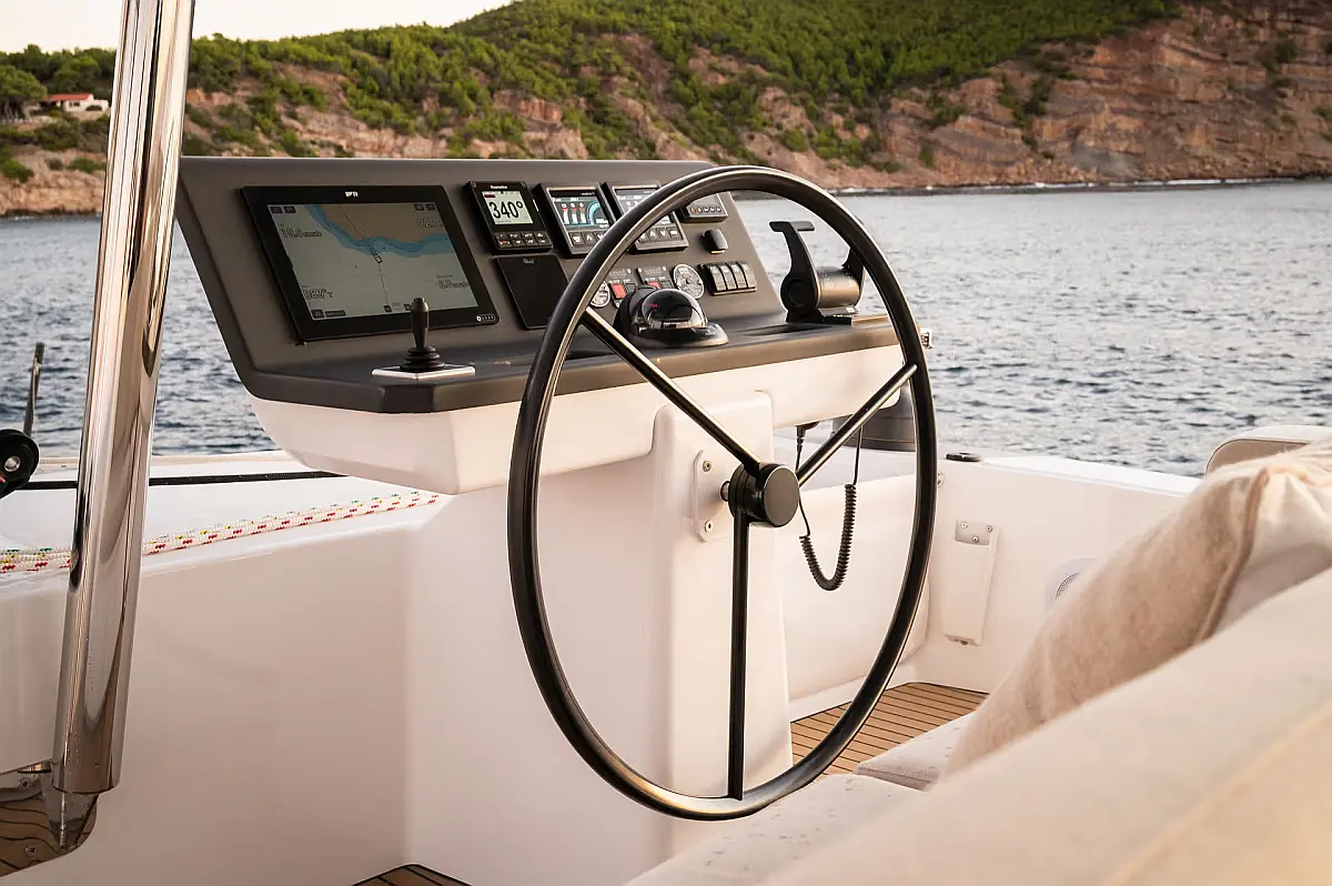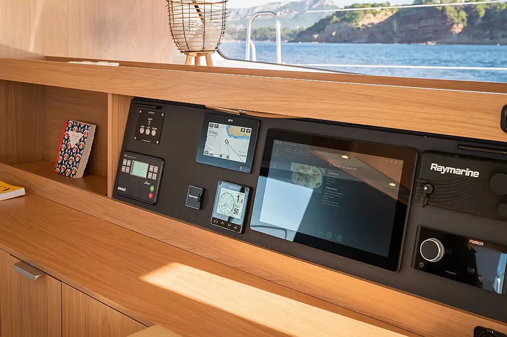 Ponte in teck sintentico, AIS, VHF radio, Cabin fans (7), Dinghy, Gas stove oven, Fridge, Microwave oven, Safety equipment for 12 peple, Lazy bag, Autopilot, Barometer (1), Bimini, Charts, Electric bilge pump, Electric winch (2), Flybridge, Electric windlass, Furling genoa, GPS plotter, Inverter, Tender and outboard, Square top Mainsail, Code 0