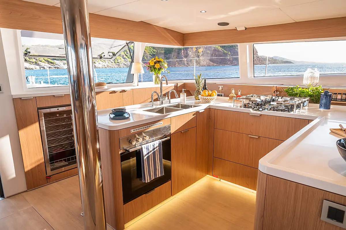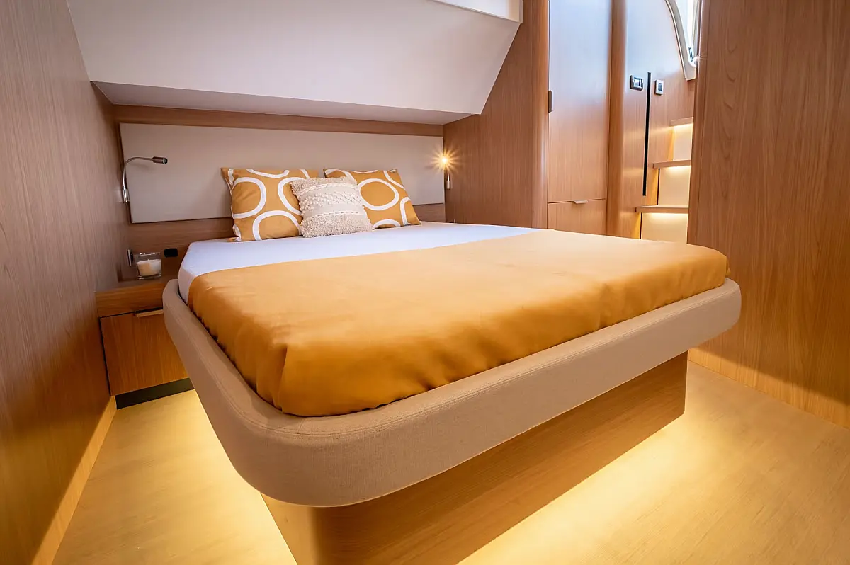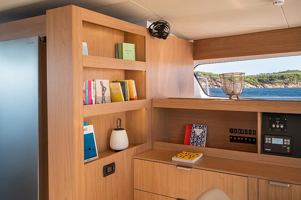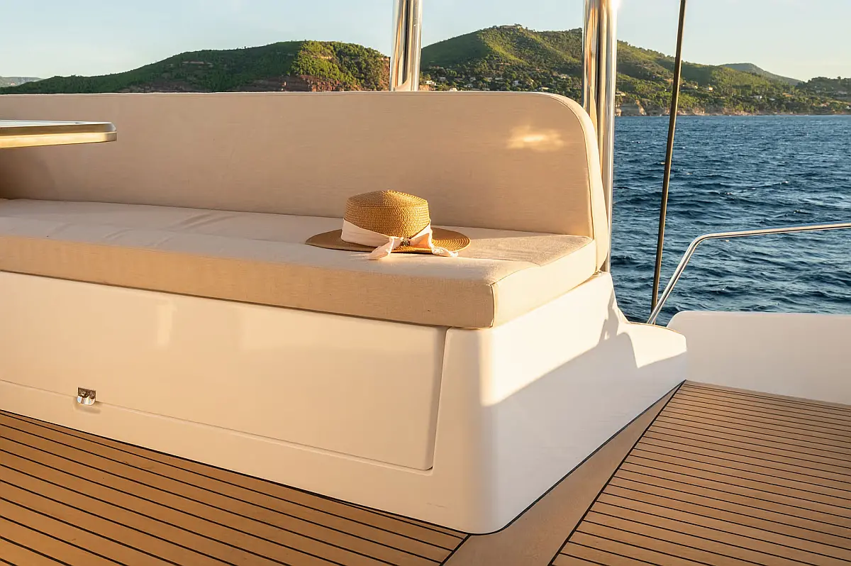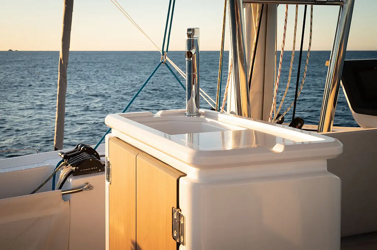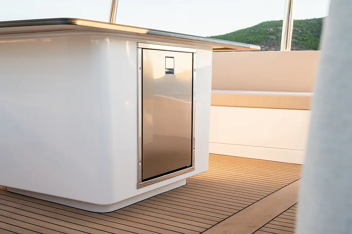 Cantina vini, Luci subacquee a LED, Piattaforma di poppa (1), Sliding curtains, Radio, Shower outside, Freezer, Barbecue, Swimming ladder, Kitchen equipment, Air Conditioning Cabins, Casse bluetooth, Cockpit cushions, Cushions, Electric WC (7), Generator, Air Conditioning Dinette