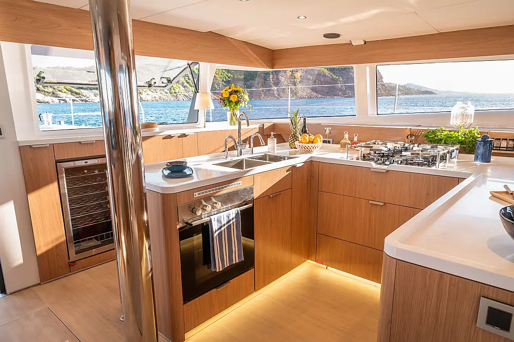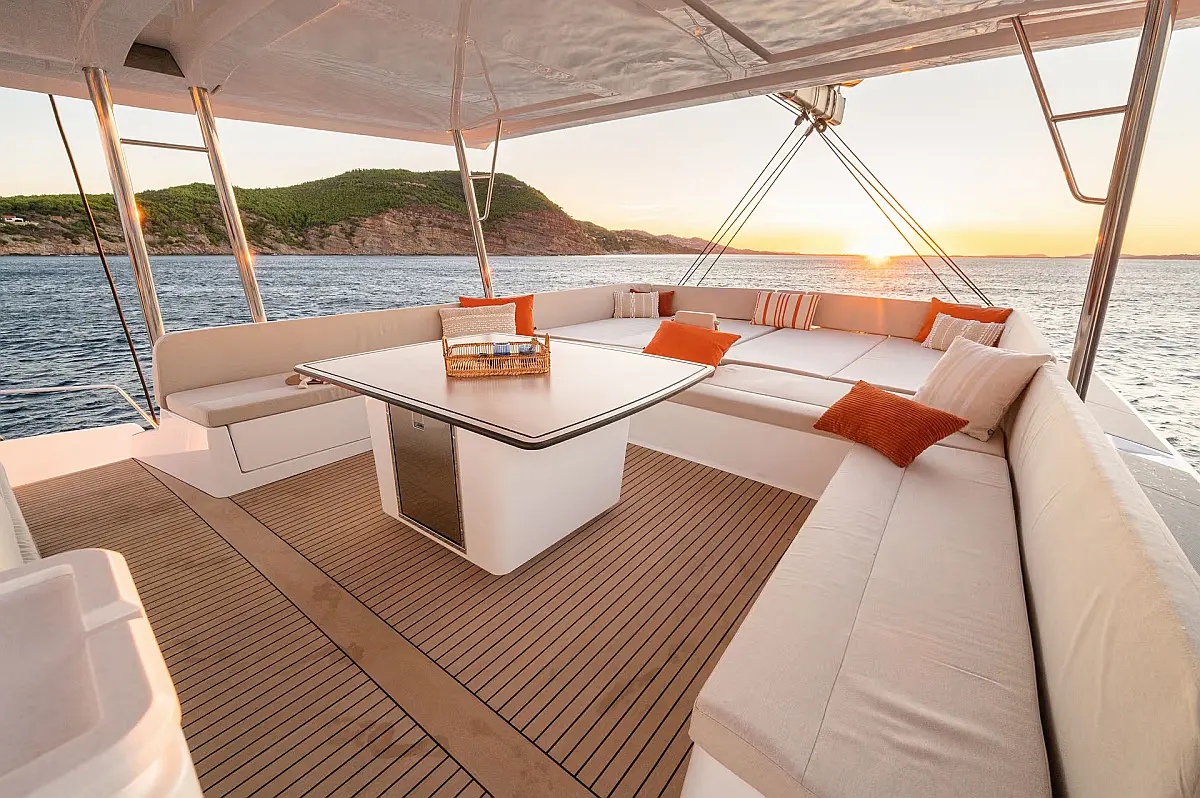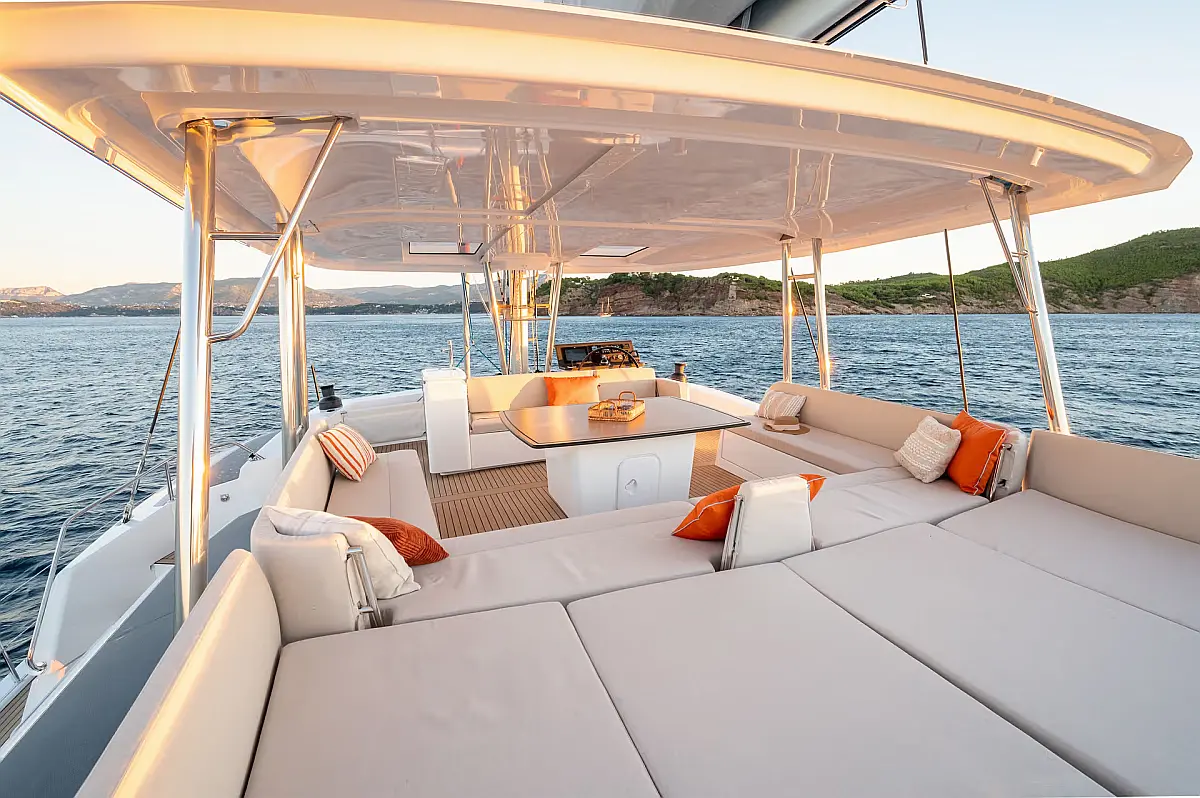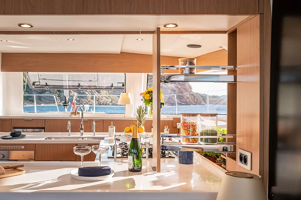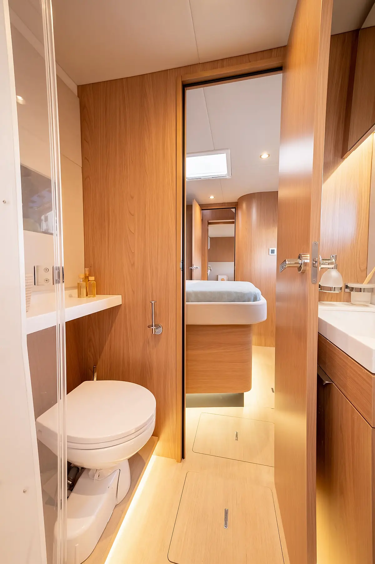 Cantina vini, Luci subacquee a LED, Piattaforma di poppa (1), Sliding curtains, Radio, Shower outside, Freezer, Barbecue, Swimming ladder, Kitchen equipment, Air Conditioning Cabins, Casse bluetooth, Cockpit cushions, Cushions, Electric WC (7), Generator, Air Conditioning Dinette
