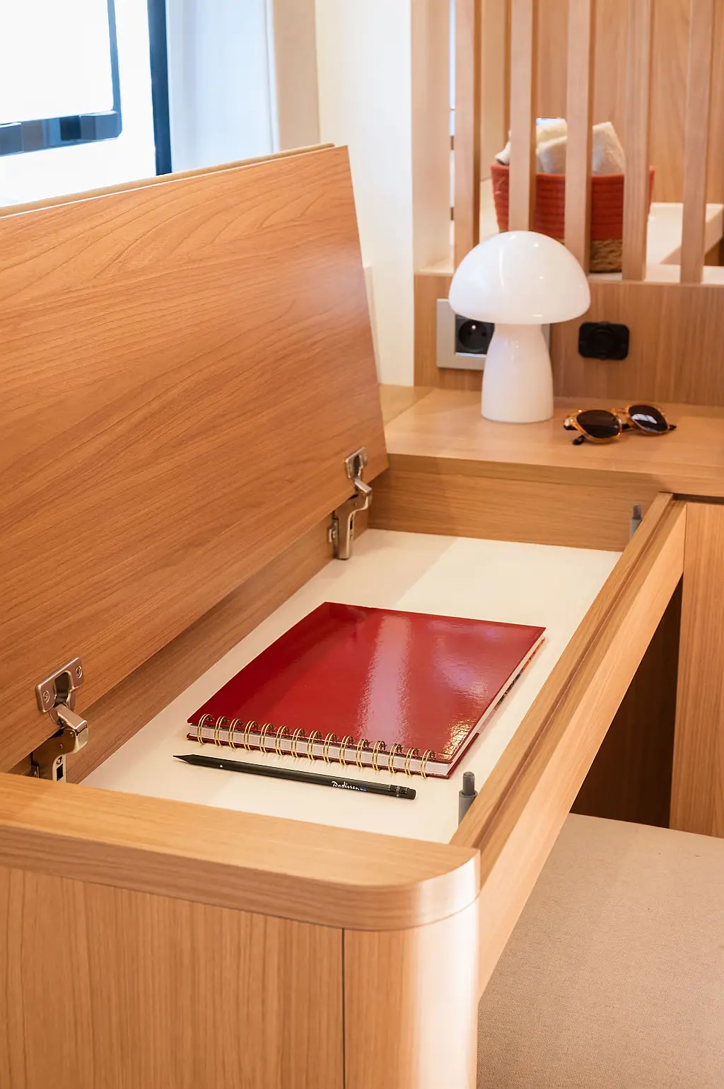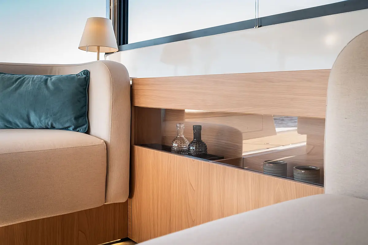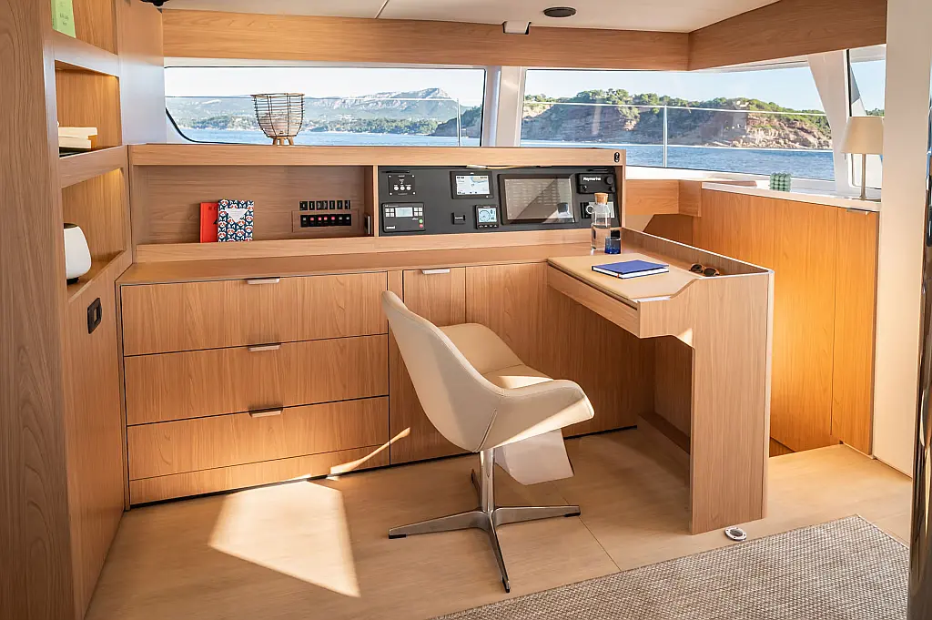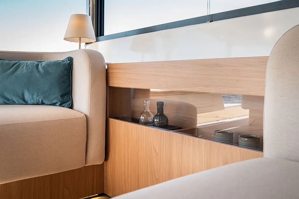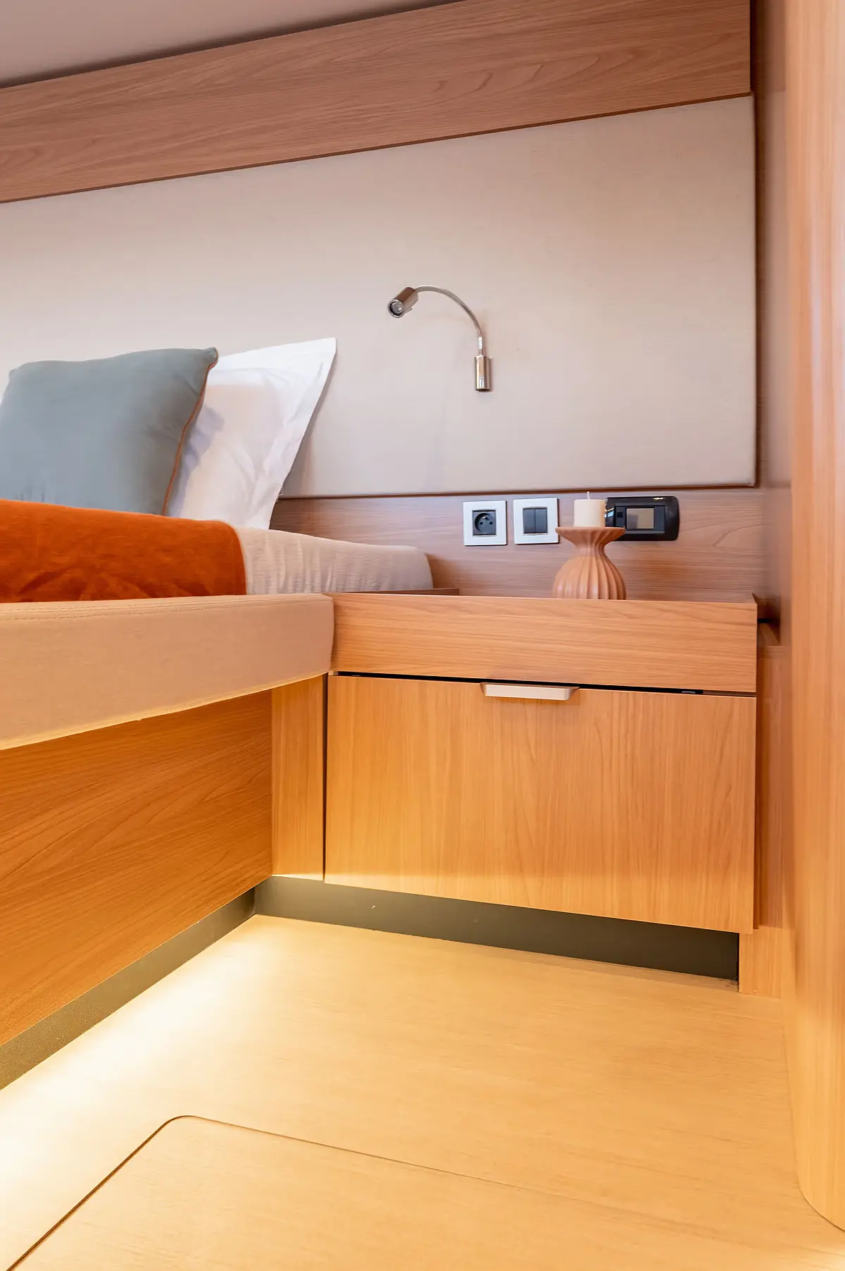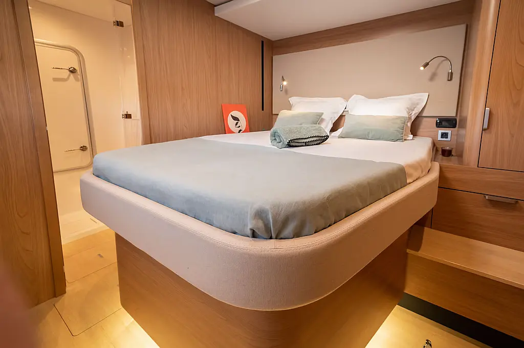 Cantina vini, Luci subacquee a LED, Piattaforma di poppa (1), Sliding curtains, Radio, Shower outside, Freezer, Barbecue, Swimming ladder, Kitchen equipment, Air Conditioning Cabins, Casse bluetooth, Cockpit cushions, Cushions, Electric WC (7), Generator, Air Conditioning Dinette