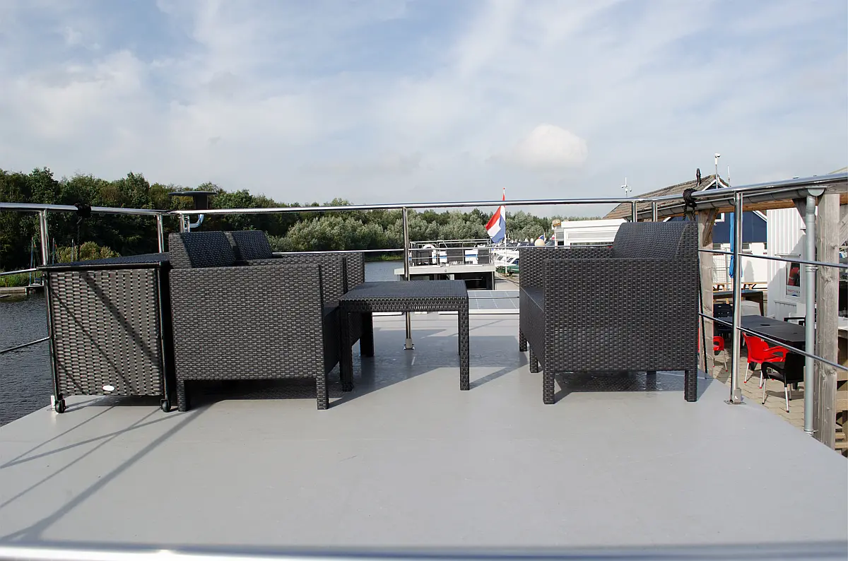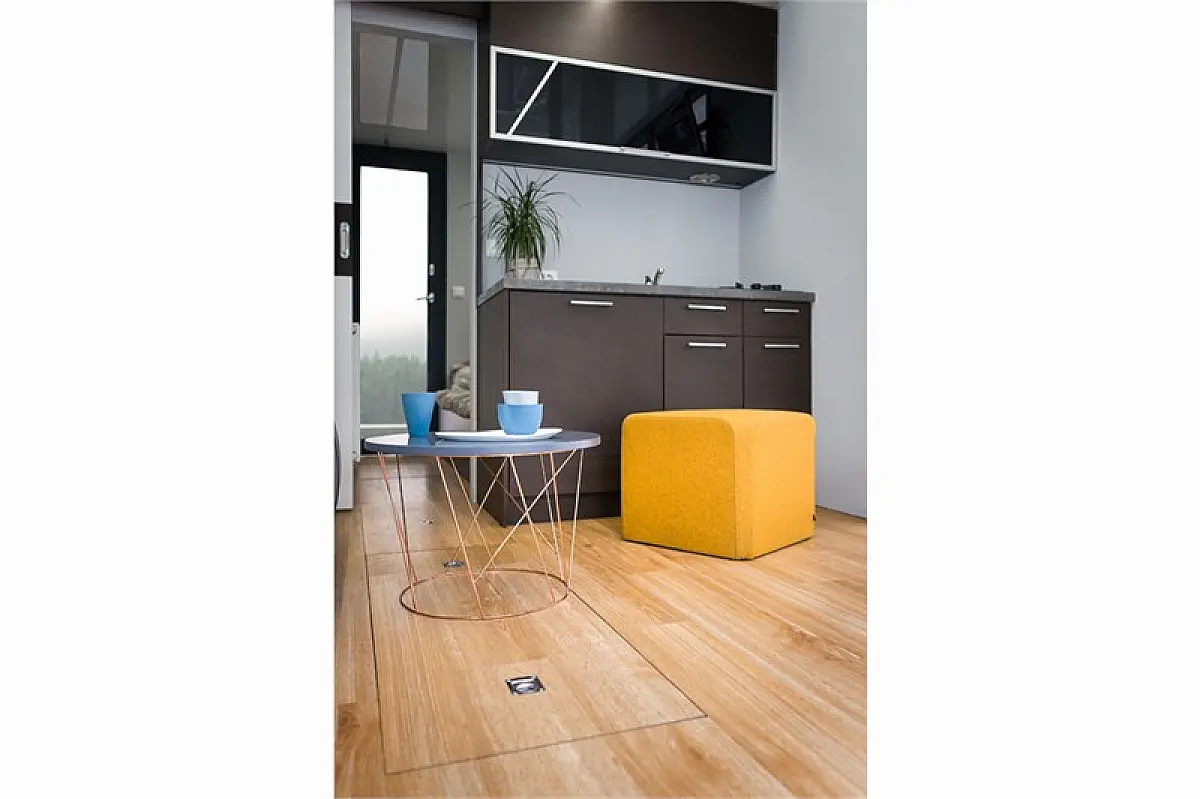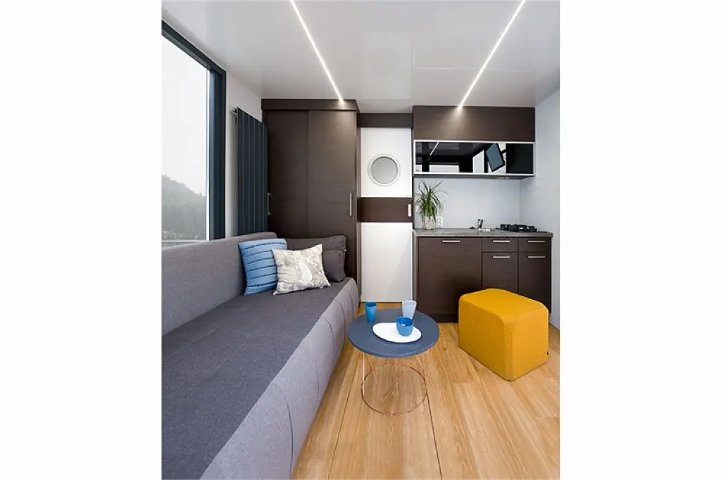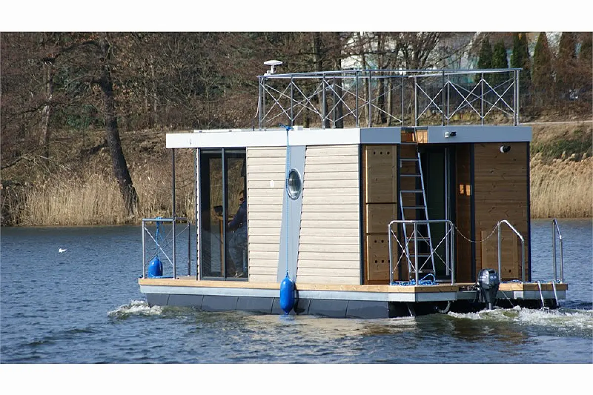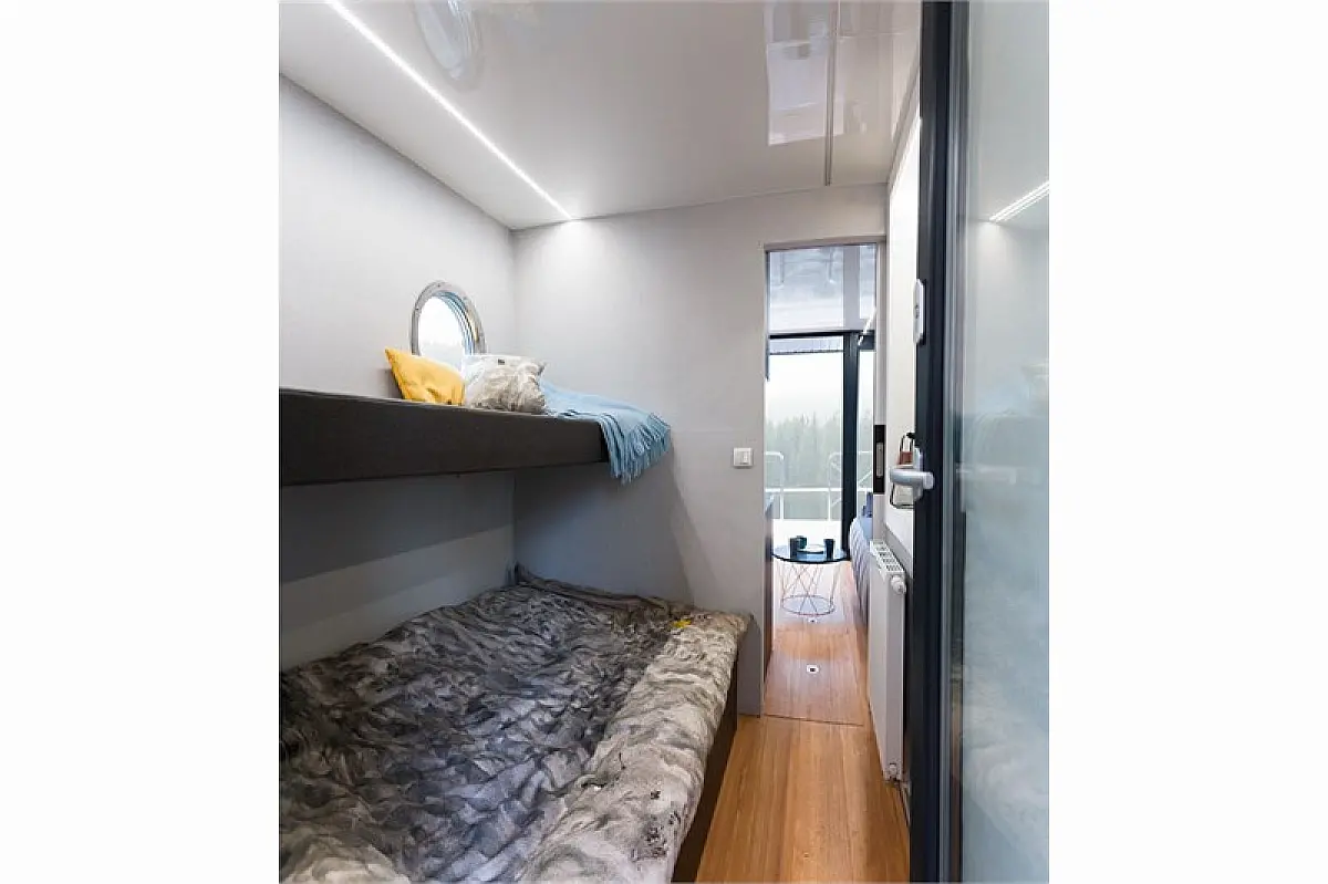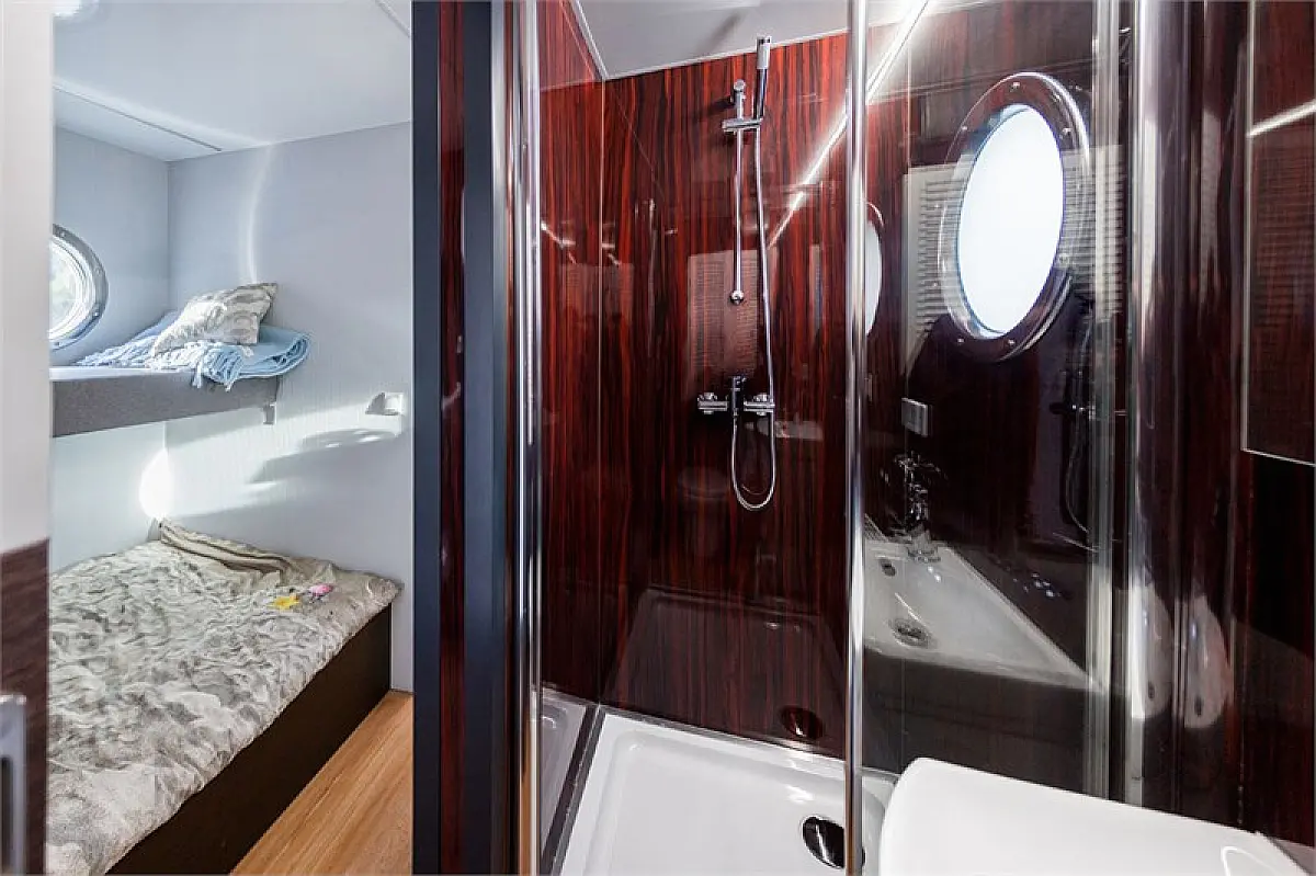 Kitchen cabinets, Sink, Bathing platform, Outboard engine, Gas stove, Sofa bed, Wardrobe, LED lighting built into the ceiling plating, Water pressure pump, Gas furnace, Hot water and heating radiators, Solar panels 2 x 250 W, Solar inverter 3 KW