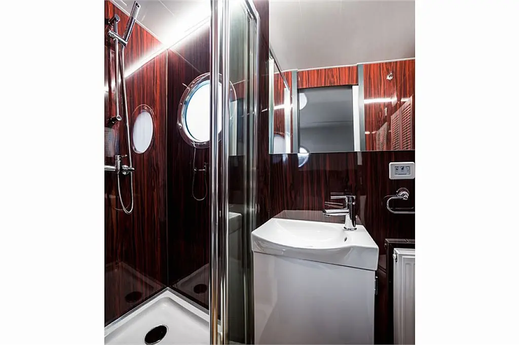 Electric Flush Toilet, Heating, Hot Water, Inverter, TV, Stove, 220 Volt Socket, Holding Tank, Shore Cable, Swimming ladder, Electric Fridge, Solar panel