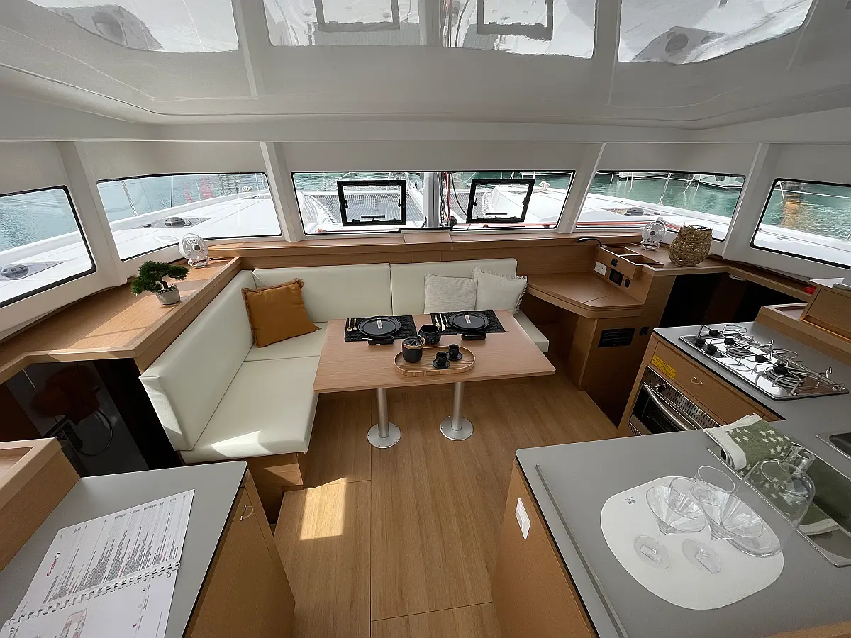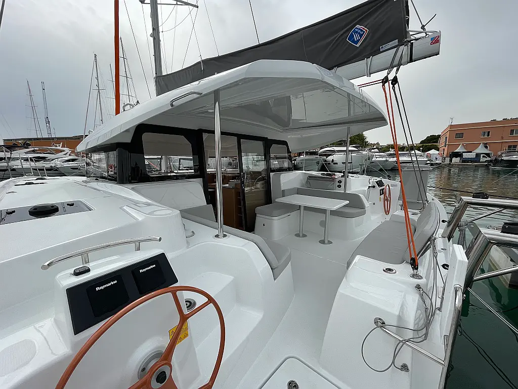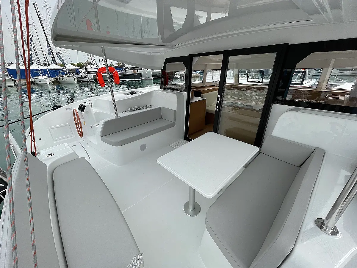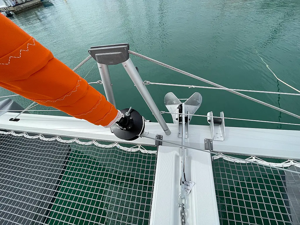 Binoculars, Torch, Fenders (8), Charts, Pilotbook, Rubber, Divider, Tool box, Kitchen equipment, Bosuns chair, Winch handles, First aid, Inverter 220V (2kWt), Gas bottle (2), Dinghy, Shore power cable, Life jackets, Autopilot, Cockpit cushions, Wind station, Echo sounder, Cockpit shower, Lazy bag, Furling genoa, VHF, Compass, Fire extinguishers, Liferaft, Mooring lines, Outboard engine, Swimming ladder, Full batten mainsail, Fire extinguisher, Flares, GPS in cockpit (true)