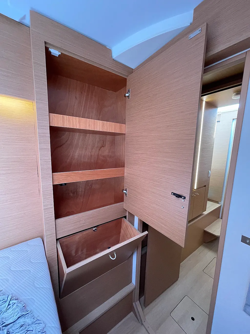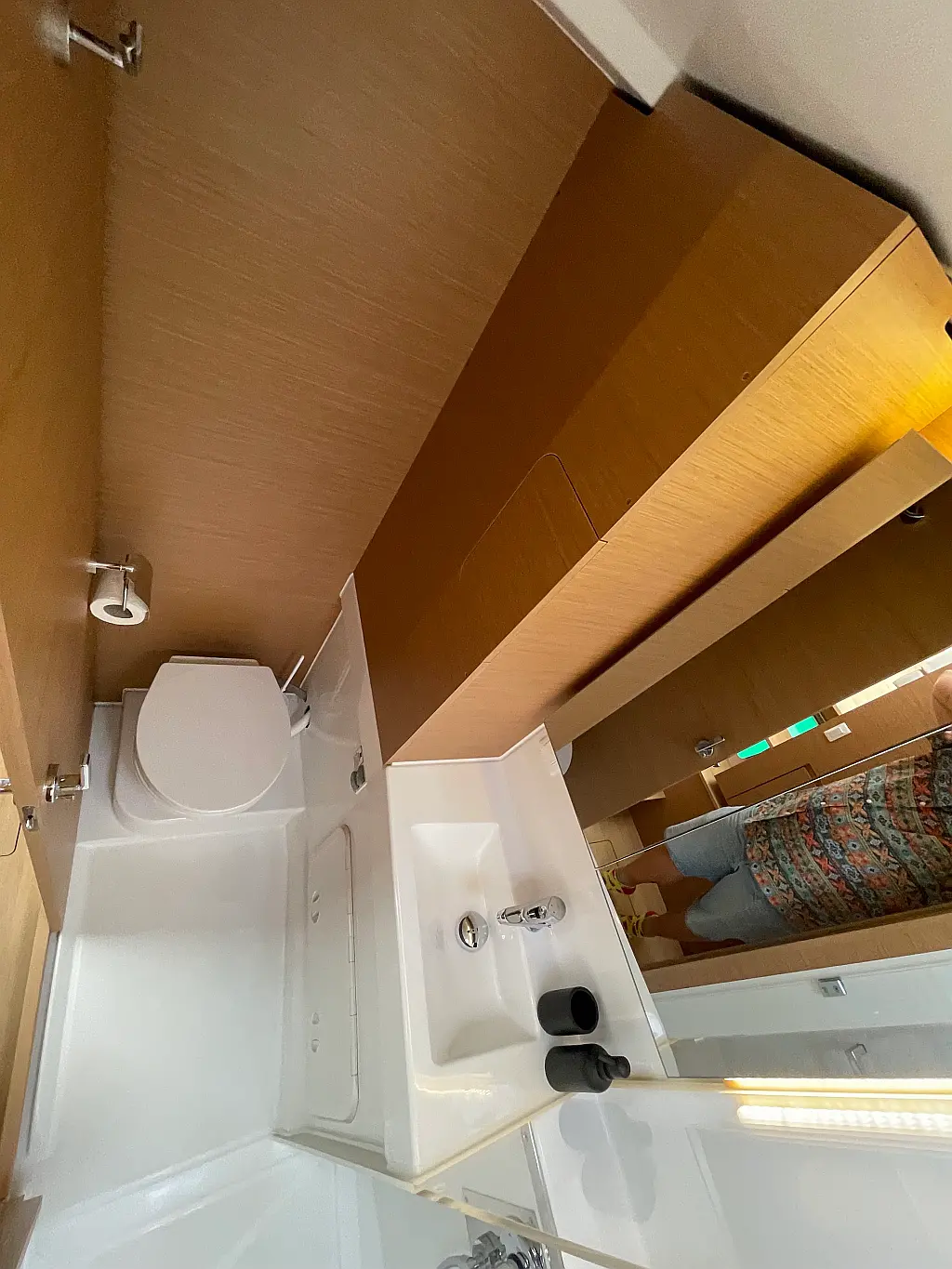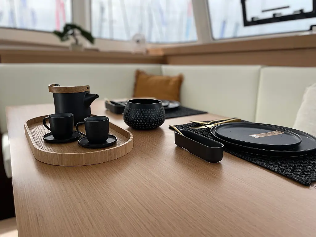 Binoculars, Torch, Fenders (8), Charts, Pencil (2), Rubber, Divider, Tool box, Kitchen equipment, Bosuns chair, Winch handles, First aid, Inverter 220V (2000kWt), Gas bottle (2), Dinghy, Shore power cable, Life jackets, Sprayhood, Autopilot, Cockpit cushions, Wind station, Echo sounder, Cockpit shower, Lazy bag, Furling genoa, VHF, EPIRB, Compass, Fire extinguishers, Liferaft, Mooring lines, Swimming ladder, Full batten mainsail, Fire extinguisher, Windlass+remote (1), Flares, GPS in cockpit (1)