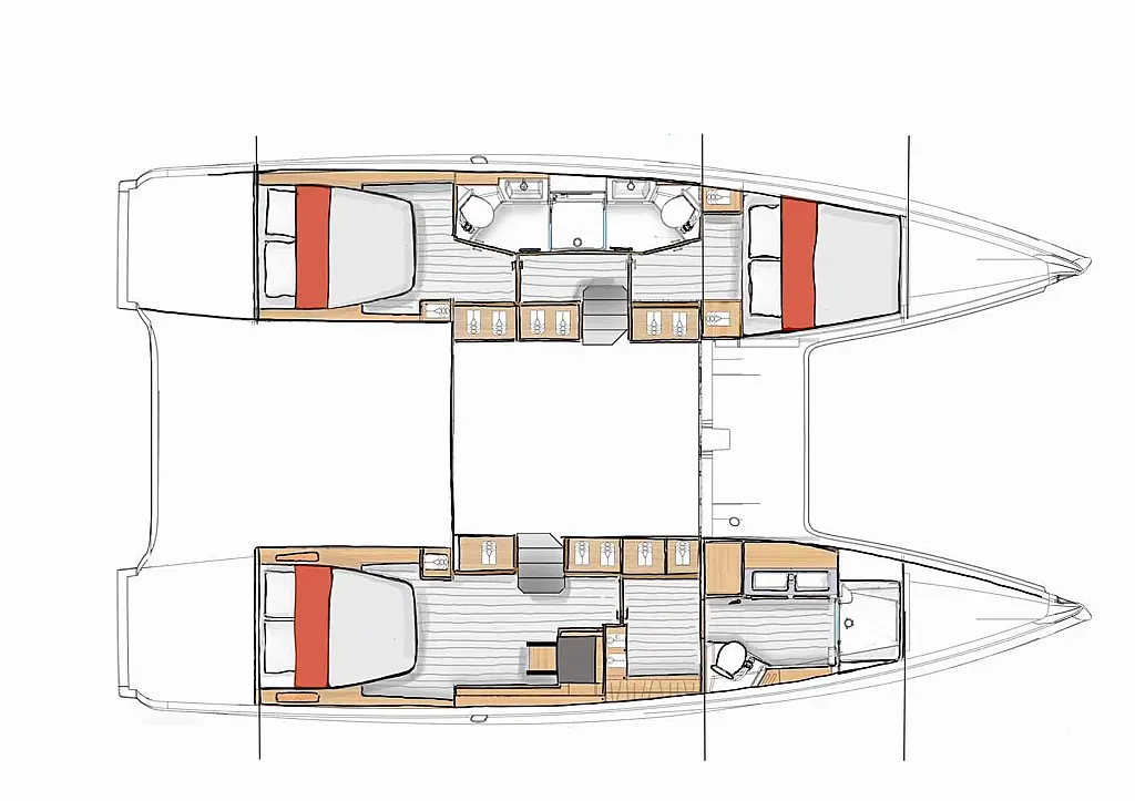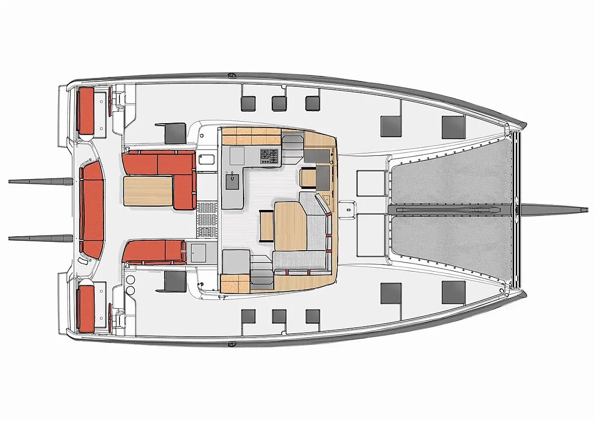 Teak Deck, Air Conditioning (Yes), Watermaker, Generator, Inverter, Electric Toilet, Underwater lights, Gangway, Indirect Lighting in cabins