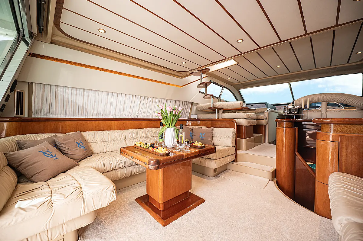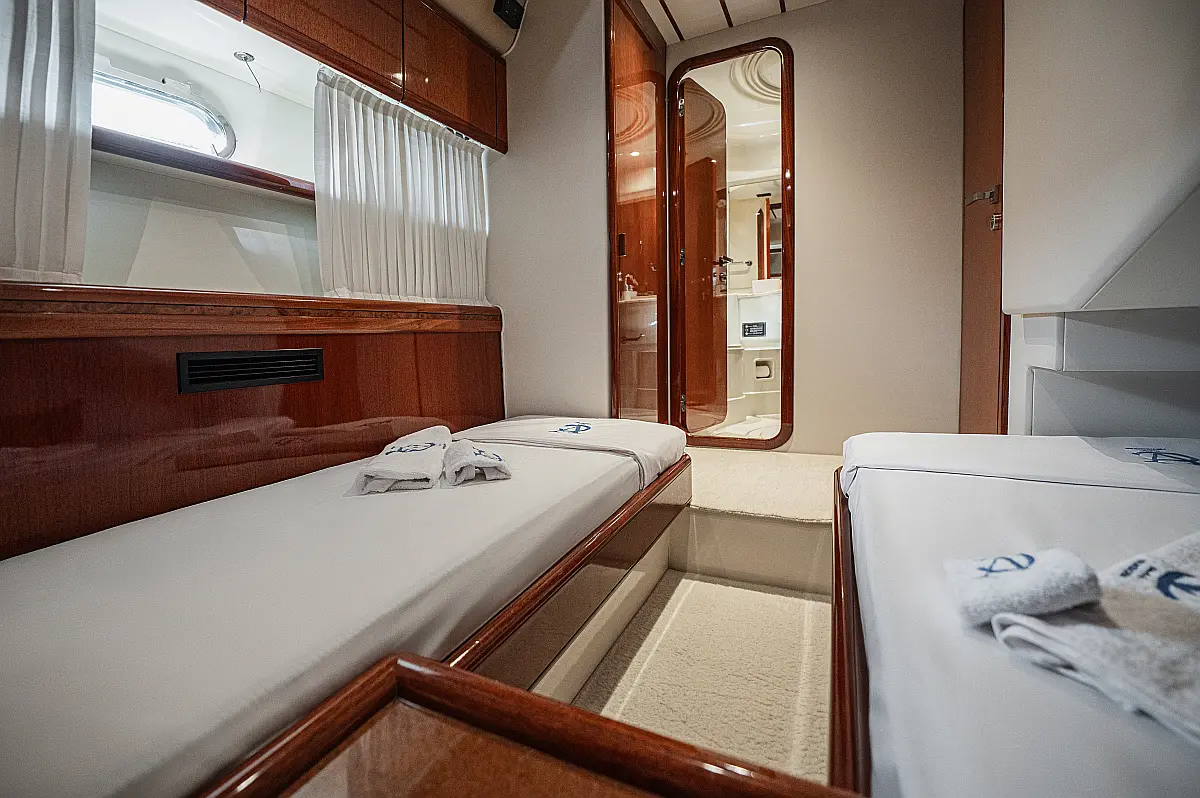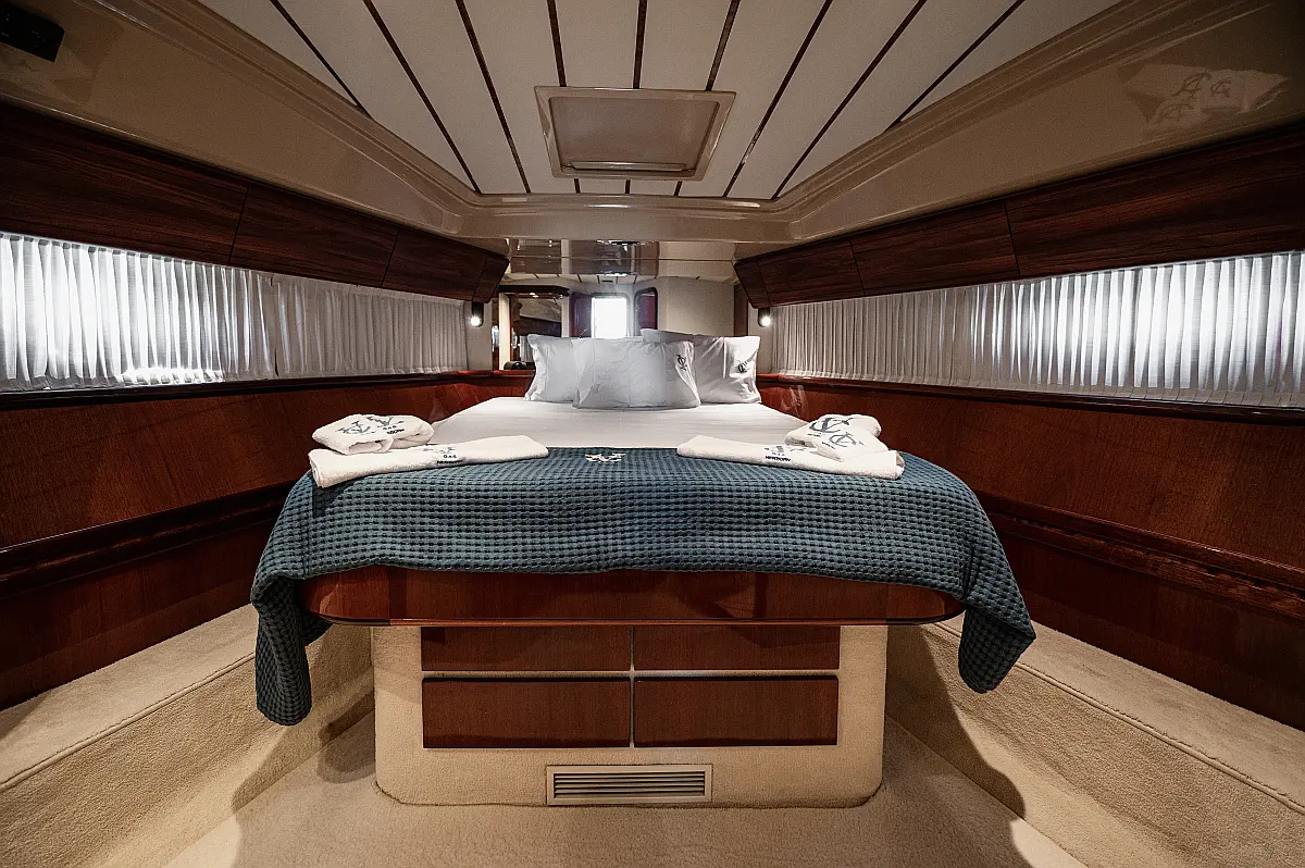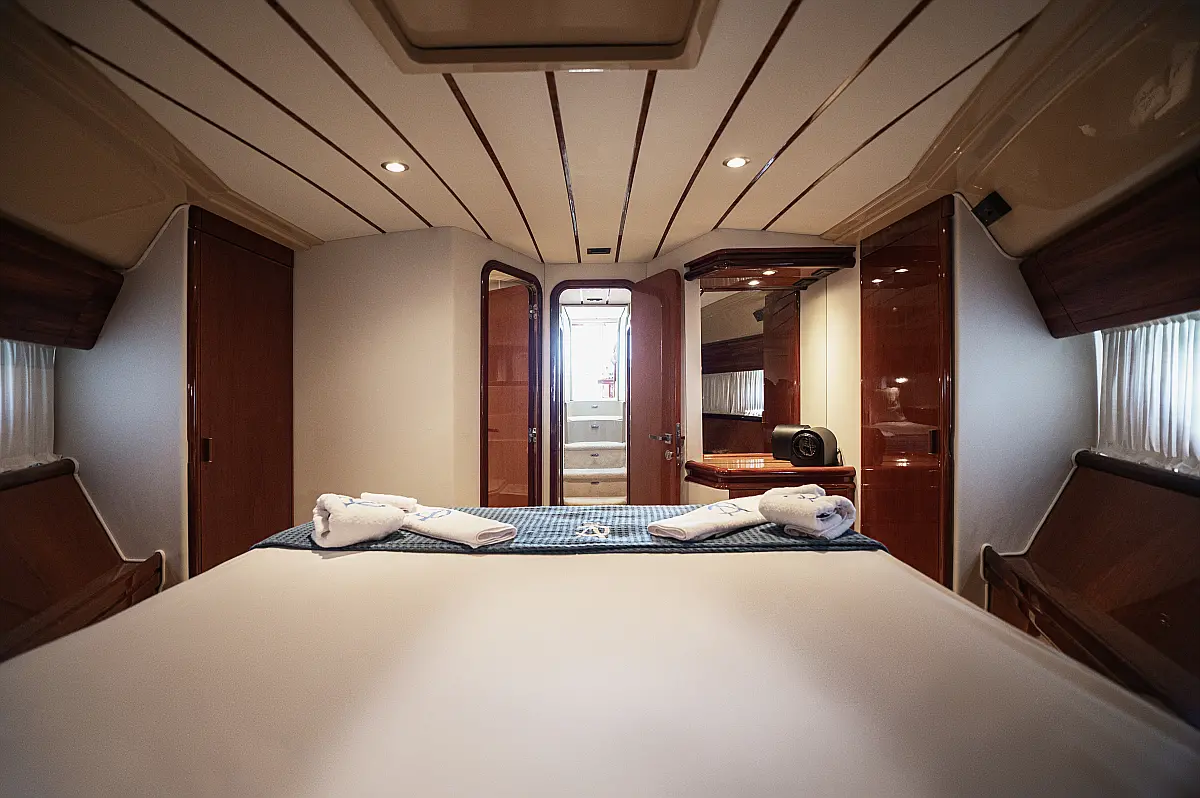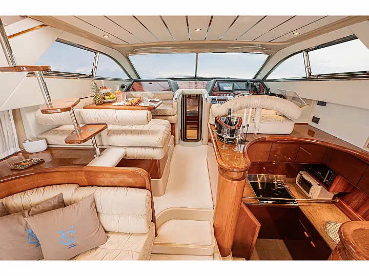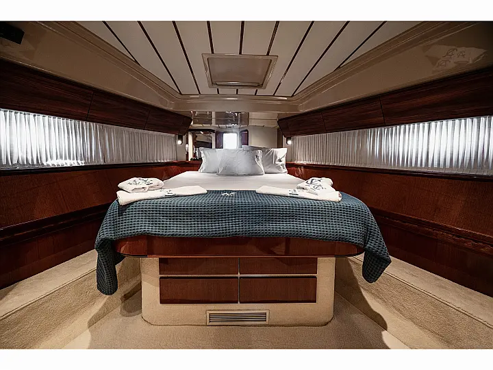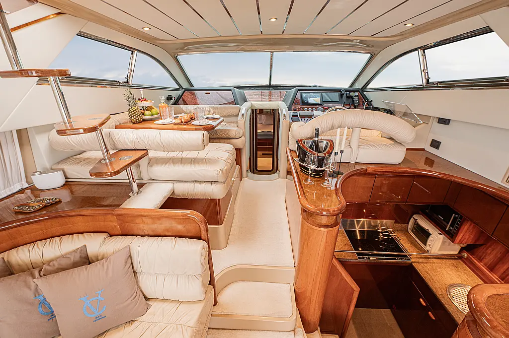 12V & USB outlet, Full audio Entertainment system, Speakers, Sundeck cushions, Underwater lights, Bilge pump, Cooler box, Bimini top-shade, Cockpit shower, Freezer, Air condition, Cook top, Cockpit cushions, Microwave, Refrigerator, First aid kit, Full safety equipment, Snorkeling equipment, 220 Volt Socket, Bow Thruster, Cockpit Speakers, Fridge on Flybridge, Cockpit table, Deck Shower, Diving mask, Electric Bilge pump, Electric toilet, Holding tank, Radio-MP3 Player, Shore cable, Hydraulic Platform, Outboard engine, Oven, Bed linen, Coffee machine, Dinghy, Gangway, Generator, Hot water, Dish Washer