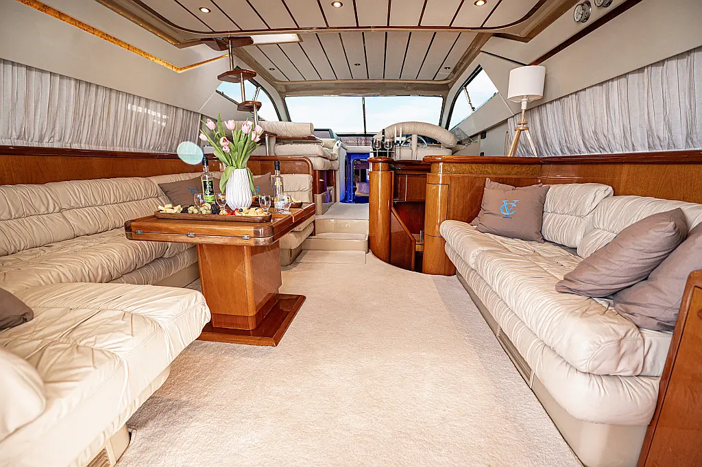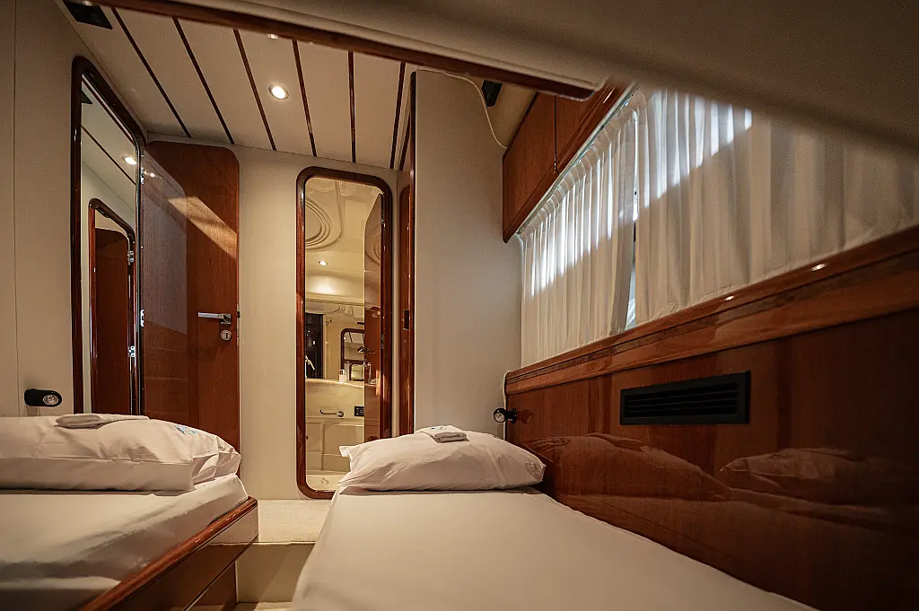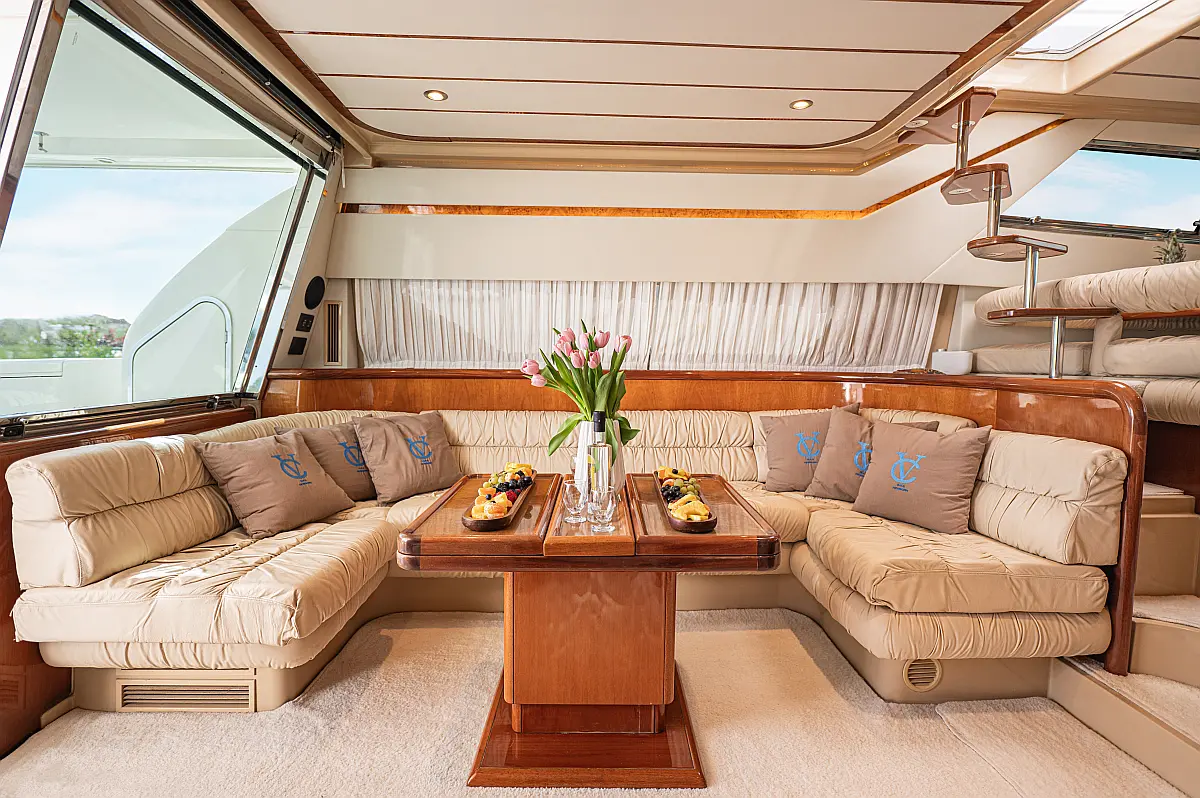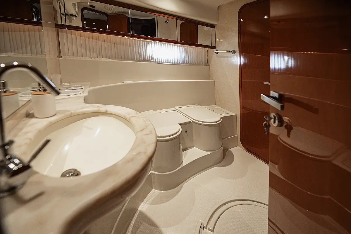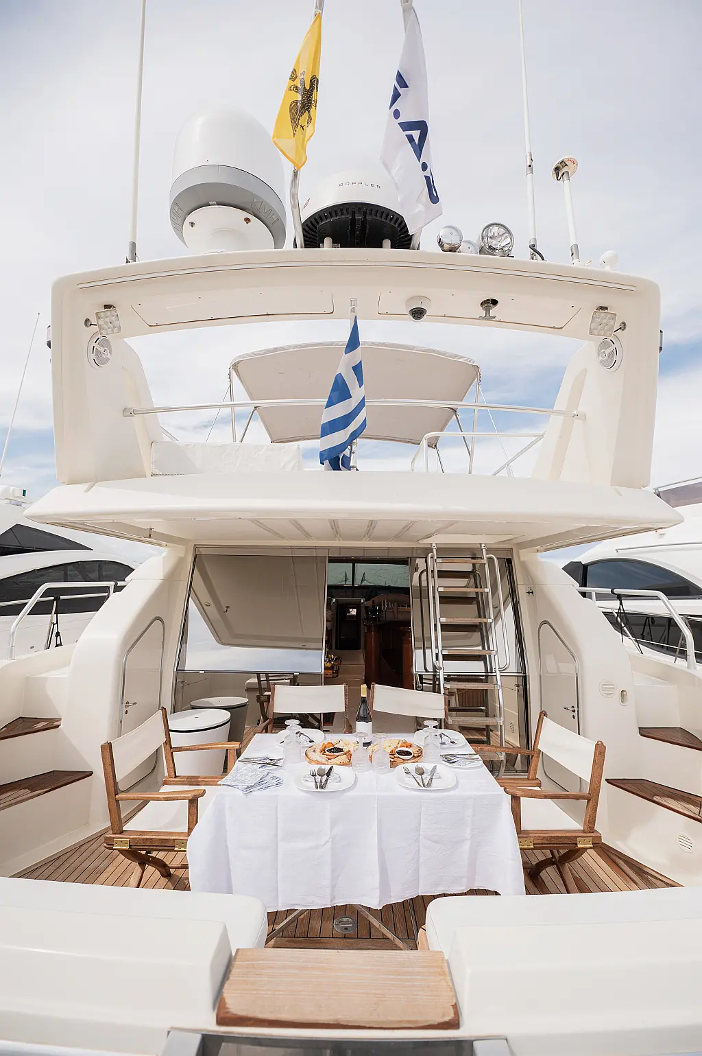 12V & USB outlet, Full audio Entertainment system, Speakers, Sundeck cushions, Underwater lights, Bilge pump, Cooler box, Bimini top-shade, Cockpit shower, Freezer, Air condition, Cook top, Cockpit cushions, Microwave, Refrigerator, First aid kit, Full safety equipment, Snorkeling equipment, 220 Volt Socket, Bow Thruster, Cockpit Speakers, Fridge on Flybridge, Cockpit table, Deck Shower, Diving mask, Electric Bilge pump, Electric toilet, Holding tank, Radio-MP3 Player, Shore cable, Hydraulic Platform, Outboard engine, Oven, Bed linen, Coffee machine, Dinghy, Gangway, Generator, Hot water, Dish Washer
