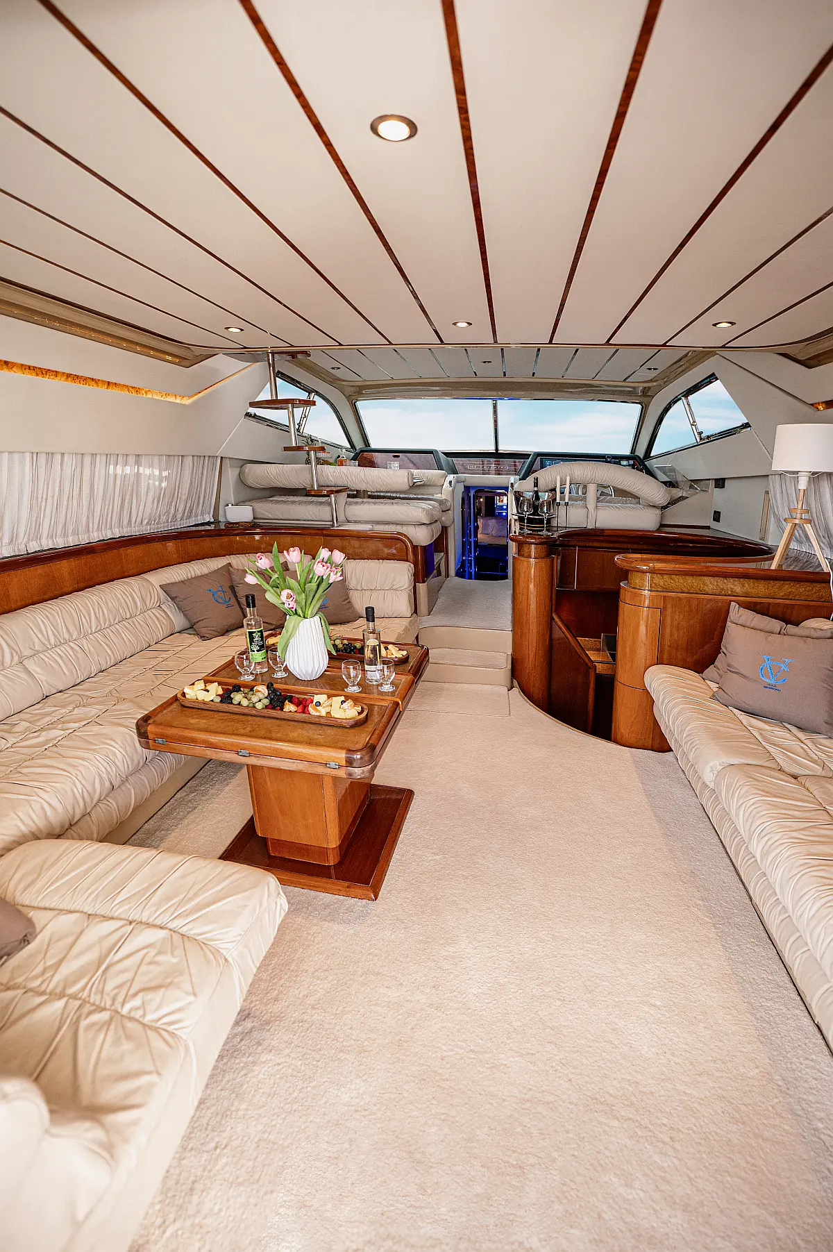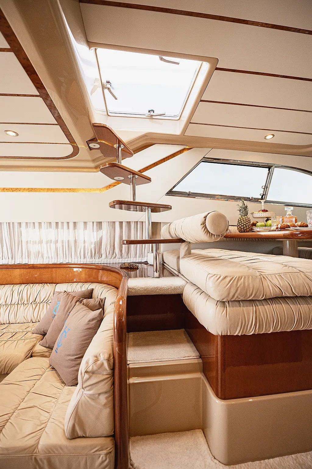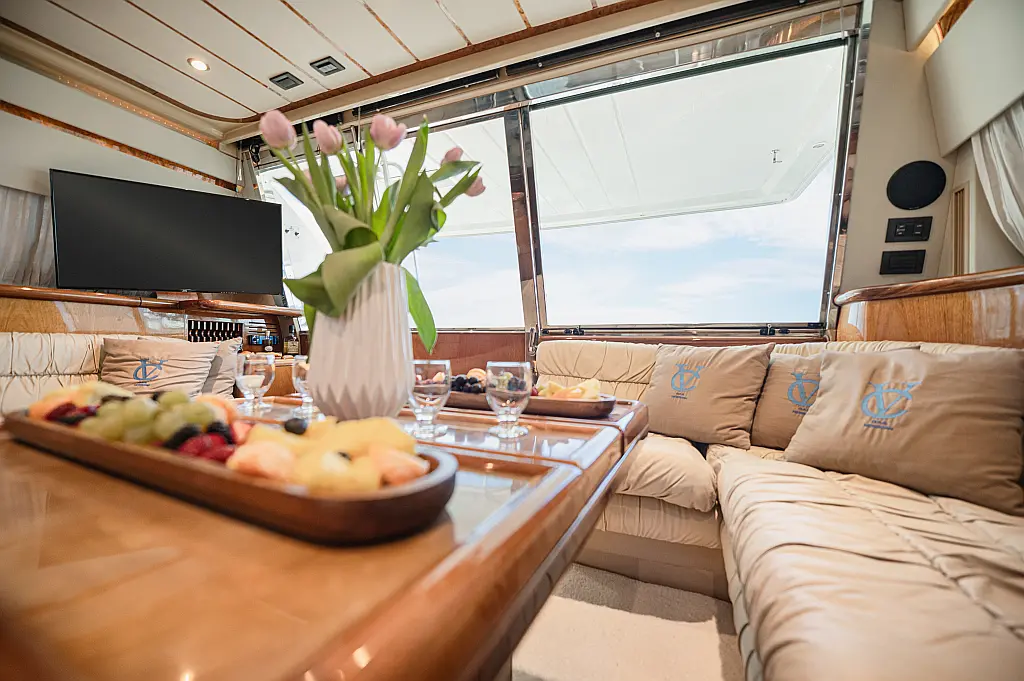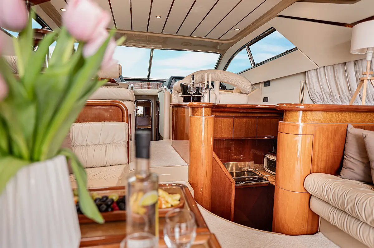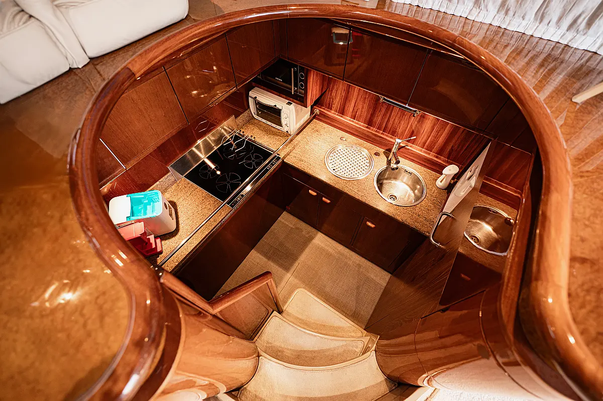 12V & USB outlet, Full audio Entertainment system, Speakers, Sundeck cushions, Underwater lights, Bilge pump, Cooler box, Bimini top-shade, Cockpit shower, Freezer, Air condition, Cook top, Cockpit cushions, Microwave, Refrigerator, First aid kit, Full safety equipment, Snorkeling equipment, 220 Volt Socket, Bow Thruster, Cockpit Speakers, Fridge on Flybridge, Cockpit table, Deck Shower, Diving mask, Electric Bilge pump, Electric toilet, Holding tank, Radio-MP3 Player, Shore cable, Hydraulic Platform, Outboard engine, Oven, Bed linen, Coffee machine, Dinghy, Gangway, Generator, Hot water, Dish Washer