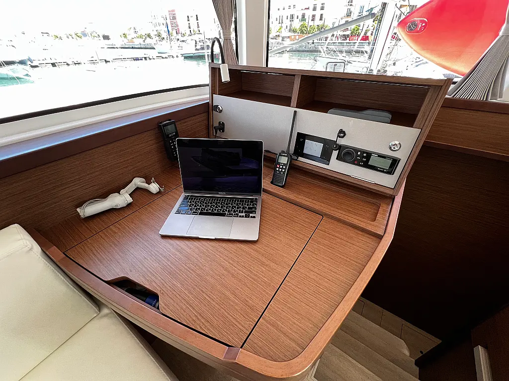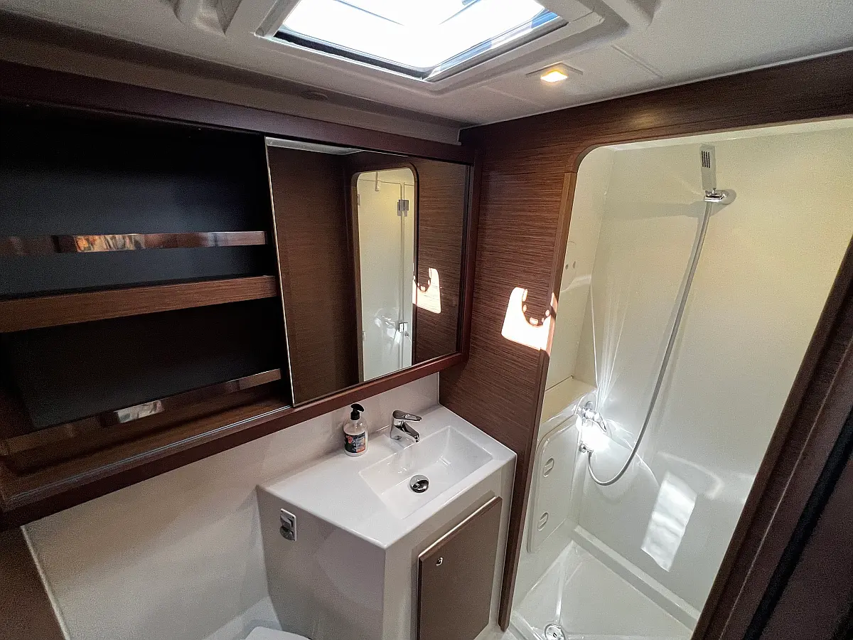 Binoculars, Torch, Fenders (8), Charts, Rubber, Divider, Tool box, Kitchen equipment, Bosuns chair, Winch handles, First aid, Dinghy, Shore power cable, Life jackets, Sprayhood, Autopilot, Cockpit cushions, Wind station, Echo sounder, Cockpit shower, Lazy bag, Furling genoa, VHF, EPIRB, Compass, Fire extinguishers, Liferaft, Mooring lines, Swimming ladder, Full batten mainsail, Fire extinguisher, Flares, 2 fridges