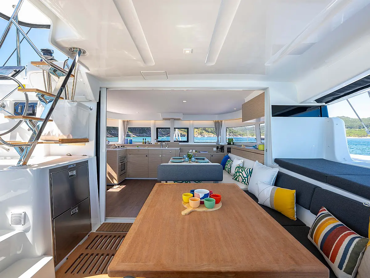 Bimini top, Electric windlass, Cockpit cushions, Autopilot, Generator, Airconditioning, Watermaker- desalinator, USB, Black water tank, Deck shower, Refrigerator, Fusion radio, GPS Chart Plotter, Hot water, Lazy bag, Lazy jacks, Outside speakers, Solar panels, Electric toilet