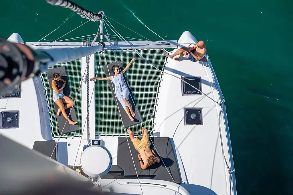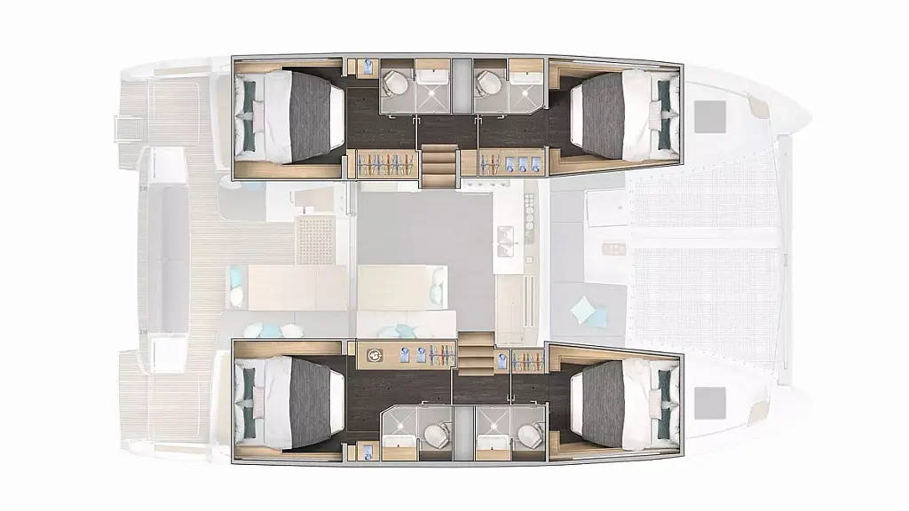 Frigo in pozzetto, Ventilatori in cabine, Pullman berth, Ventilatori in dinette, Bagni elettrici (4), A/C, Pannelli solari, Dissalatore