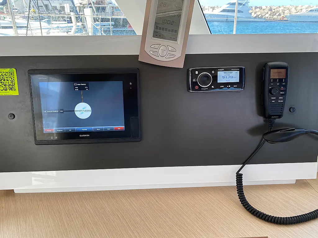 Binoculars, Fenders (8), Tool box, Kitchen equipment, Bosuns chair, Winch handles, First aid, Inverter 220V (true), Gas bottle (2), Dinghy, Shore power cable, Life jackets, Autopilot, Cockpit cushions, Wind station, Cockpit shower, Bimini, Lazy bag, Furling genoa, VHF, Compass, Fire extinguishers, Liferaft, Mooring lines, Swimming ladder, Full batten mainsail, Windlass+remote (true), Solar panels, GPS in cockpit (true), Soft night lights arround