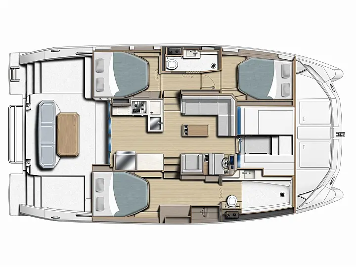 GPS Plotter, Fuel gauge (x2 at helm station), Absorbed Glass Matt (AGM) batteries, Alternator (x2), 12V battery isolator, Chart plotter, Wind data, Autopilot, VHF radio, TV, Radio CD player/mp3, Cockpit speakers, DVD, Shore power cable (1), House battery bank (210Ah), USB ports in cabins, Battery charger (60 amp), Multifunction touchscreen (9" with WiFi capability), Depth sounder, Solar panels (2x70W each, fitted to hardtop), USB socket at switch panel, double (1), USB socket at chart table, double (2), Underwater lights (x2, stern mounted), Microwave oven, Rear view camera, Fog horn