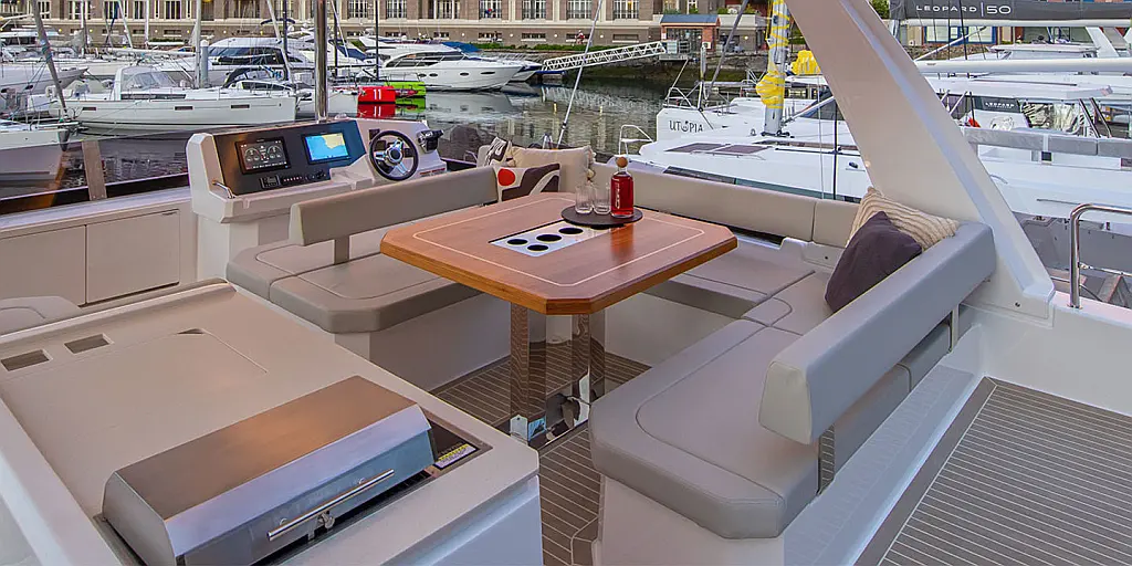 Cockpit table, Locker (3), Compass (at helm position), Bimini, Liferaft locker (1), Hardtop cover, Electric grill, LED floor lighting, Wetbar (with sink, fauced and Corian worktop)