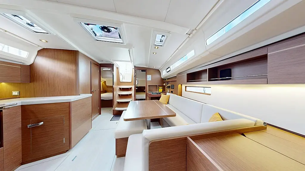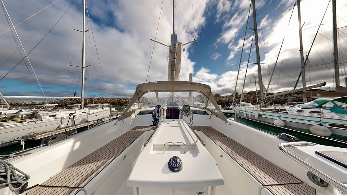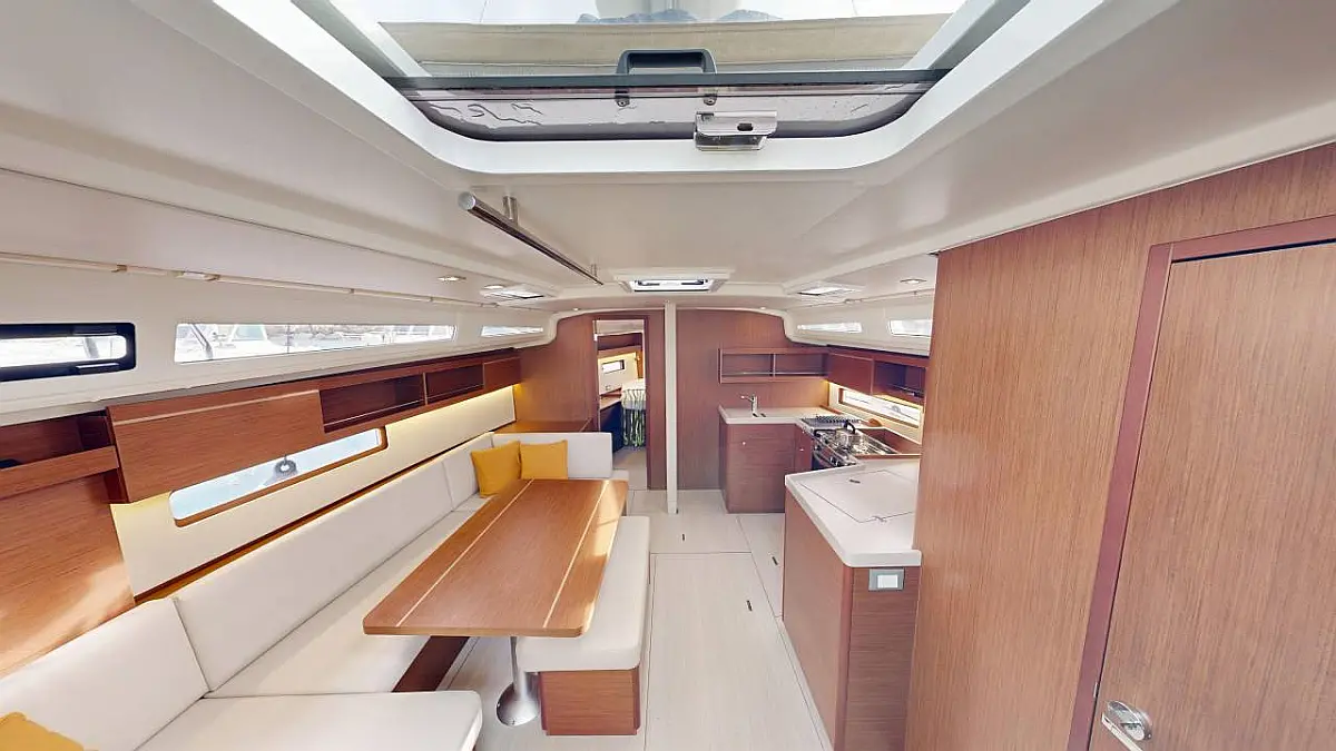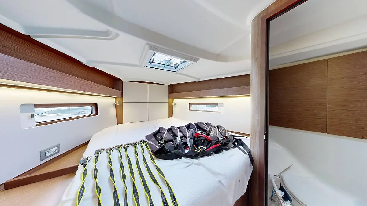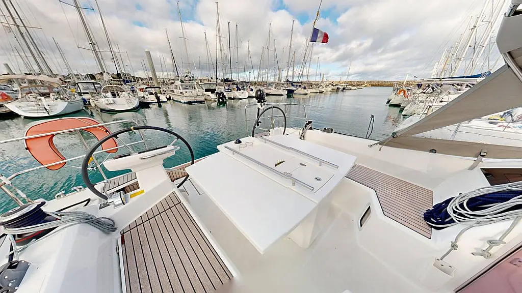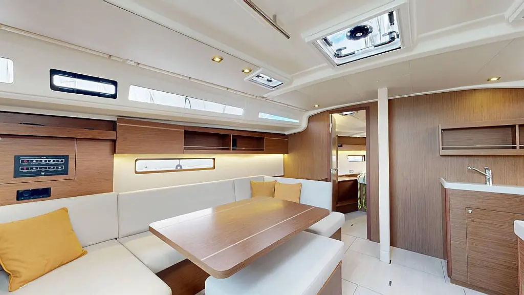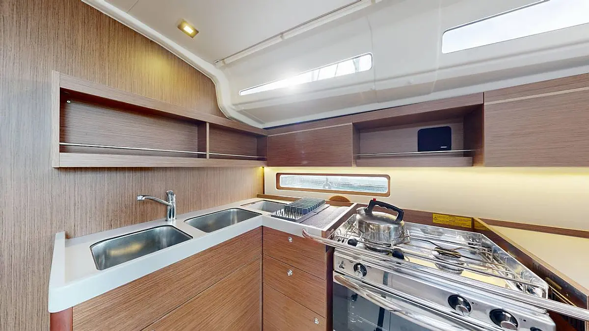 Stainless steel oven + 2 burners, Refrigerator, Swim platform, Cockpit shower, 12V network, Sprayhood, Hot water under pressure, 2 toilets + 2 showers, Exterior speakers for music and VHF, Convertible saloon into a double bed, USB charger inside + outside, 230 V network with inside plugs, Dinghy 2.35 m under, Dinghy engine Suzuki DF 2.5 HP, Cockpit Table "lux", Cockpit lighting