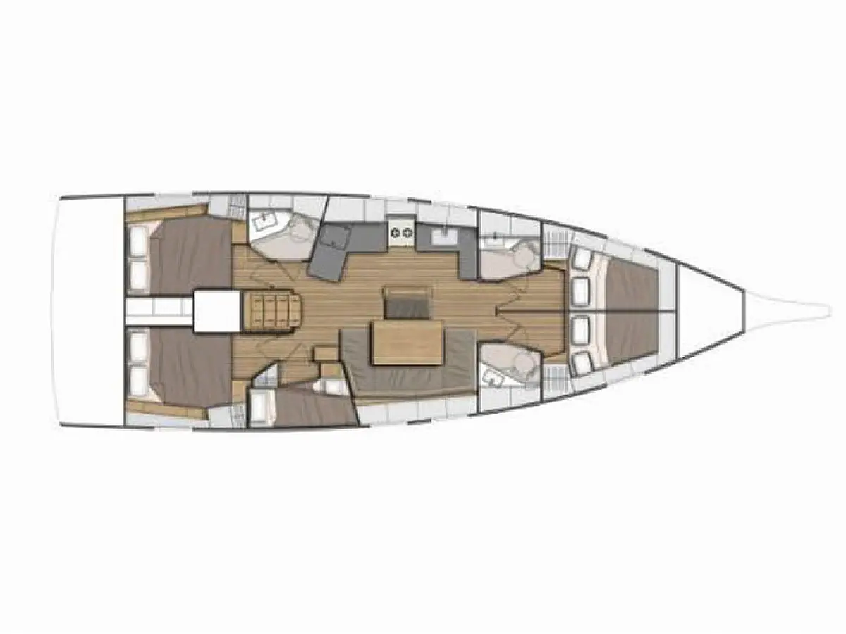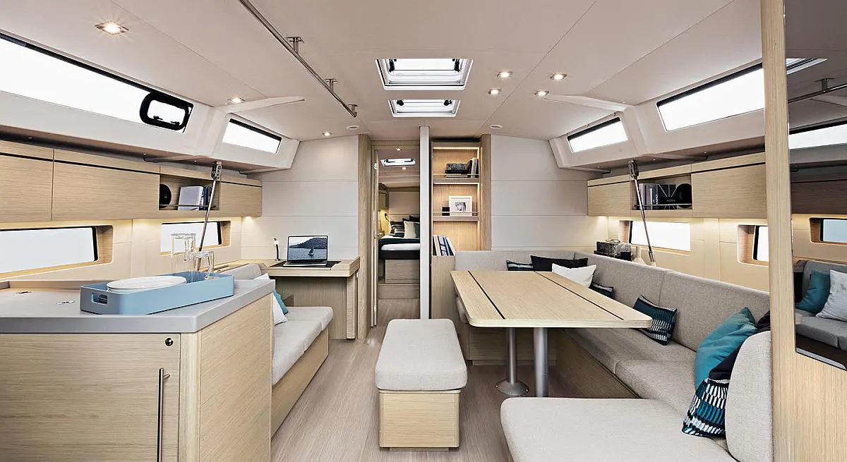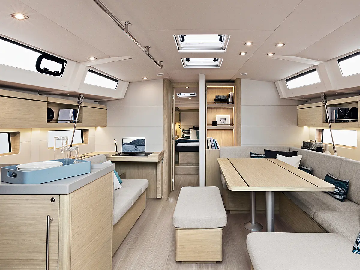 Cockpit speakers, Bimini, Outboard engine, Dinghy, Electric anchor windlass, Deck shower, Cockpit table, Sun shade