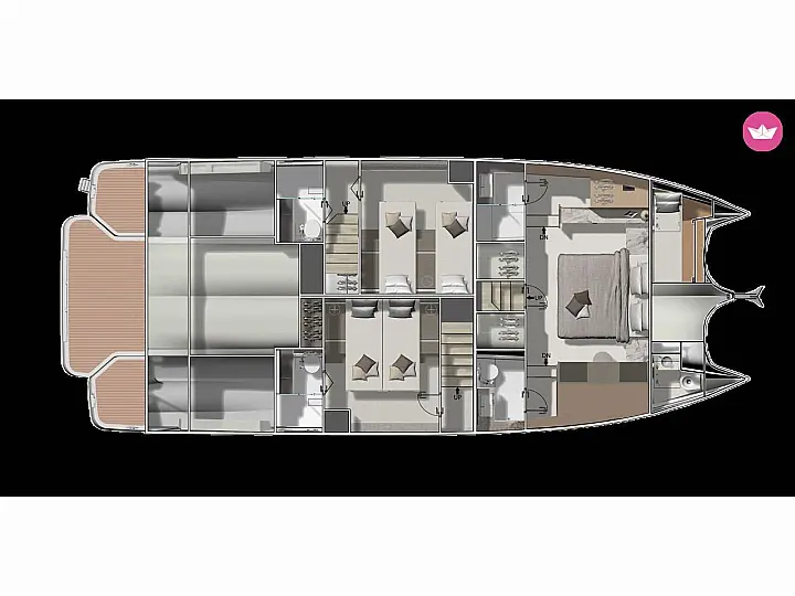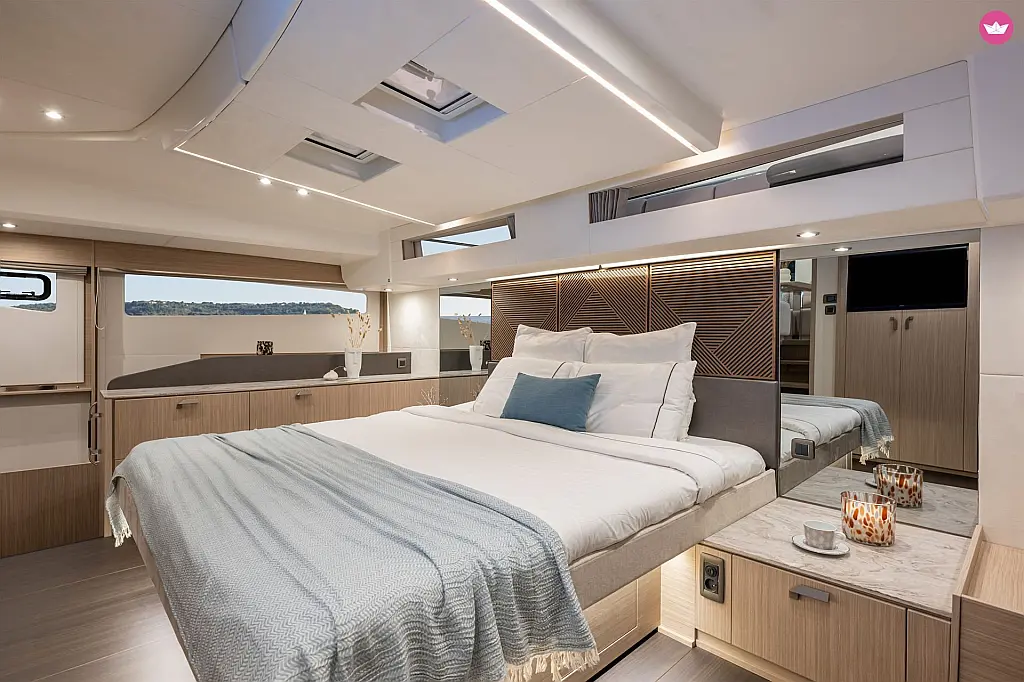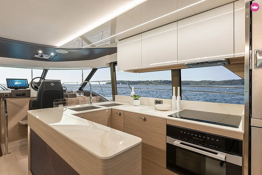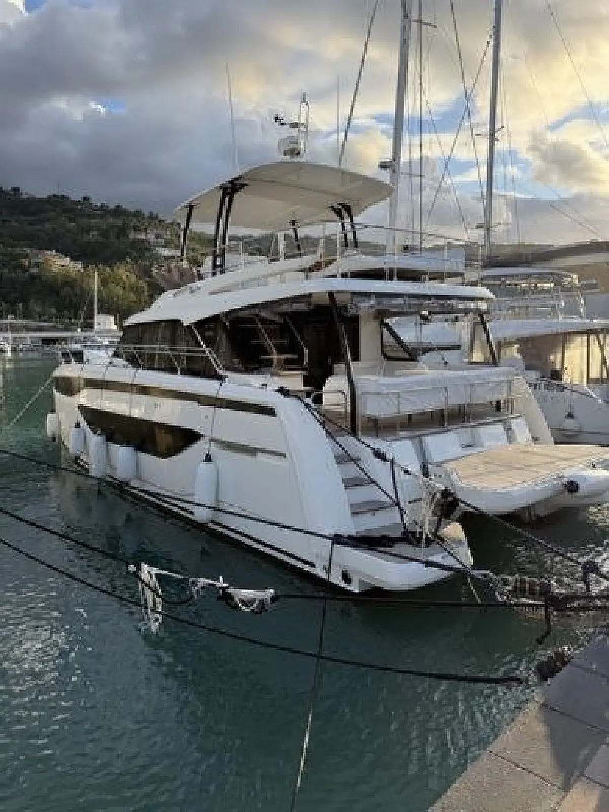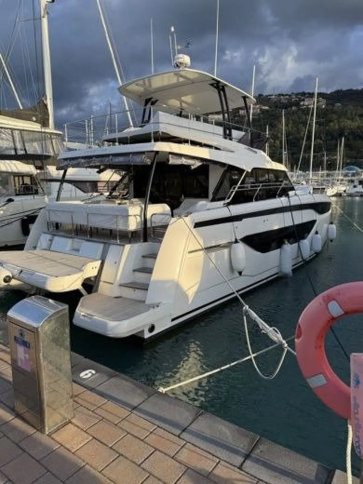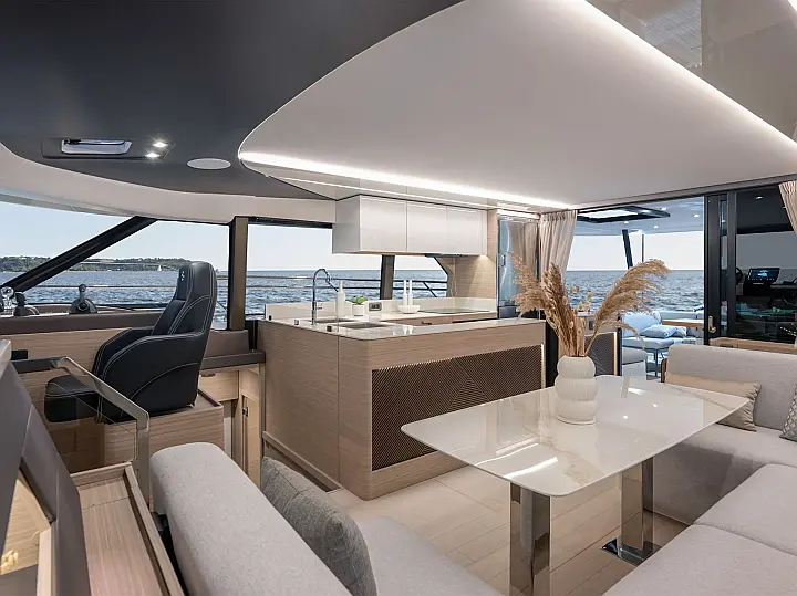 Awning, Splash hood, Shower on deck, Dining table, Stereo system, Cockpit system, Teak deck, Stern Platform, Swim ladder, Protective net