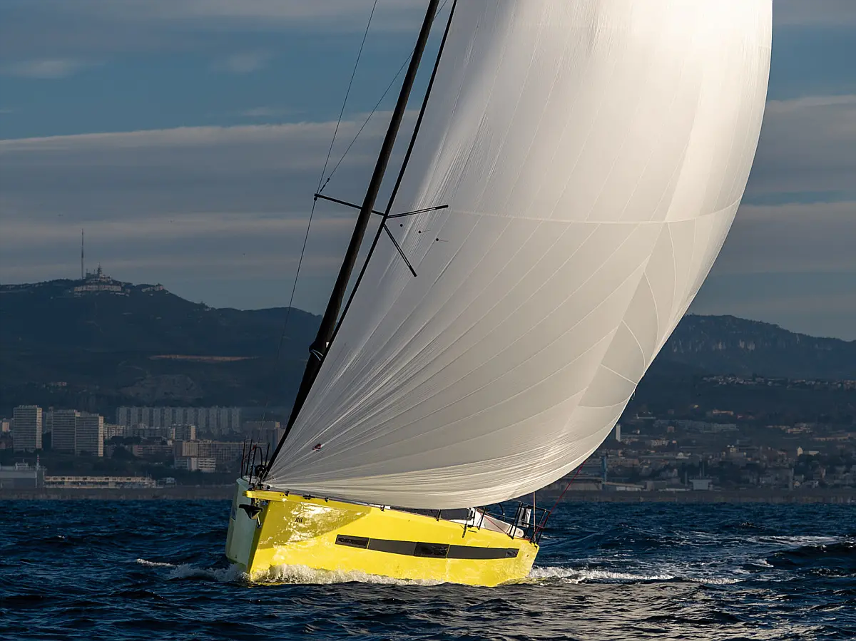 Spray hood, Carbon mast, Indoor shower, Fridge, Self-inflating vests (6), Nautical guides and maps, Autopilot, Gennaker on furler, AIS Transmitter / Receiver, Electric windlass, Black water tank, Multifunction screen instrument: log-speedo-depth sounder, Keel (2), Rudders, Asymettric spinnaker (option), DST800 analog tri-probe, Kitchen utensils, 3 batteries pack, Dinghy, Safety equipment, Miscellaneous small equipment, Pressurized hot water, Deck shower (hot water), 2-cabin version + technical hold, Two steering wheels, Mailsail, Furling solent, Furling staysail, Navigation unit with Axiom 9 plotter + cartography, VHF DSC Ray 53 with splitter and integrated GPS, Shore charger, Removable cockpit table